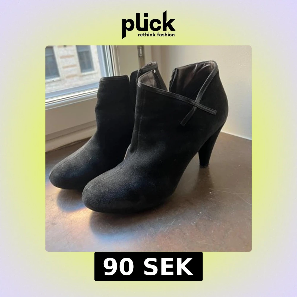 Snygga svarta boots i mocka med klack och dragkedja på sidan. Perfekta för en stilren look. De har en spetsig tå och en diskret remdetalj.