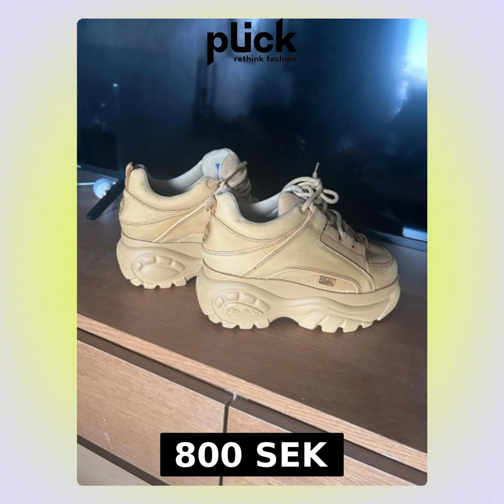 Buffalo sneakers i beige. Skorna har snörning och är tillverkade i syntetmaterial med tydliga Buffalo-loggor på sidan och under sulan. Har aldrig använt skorna då de va för stora för mig storlek 39.