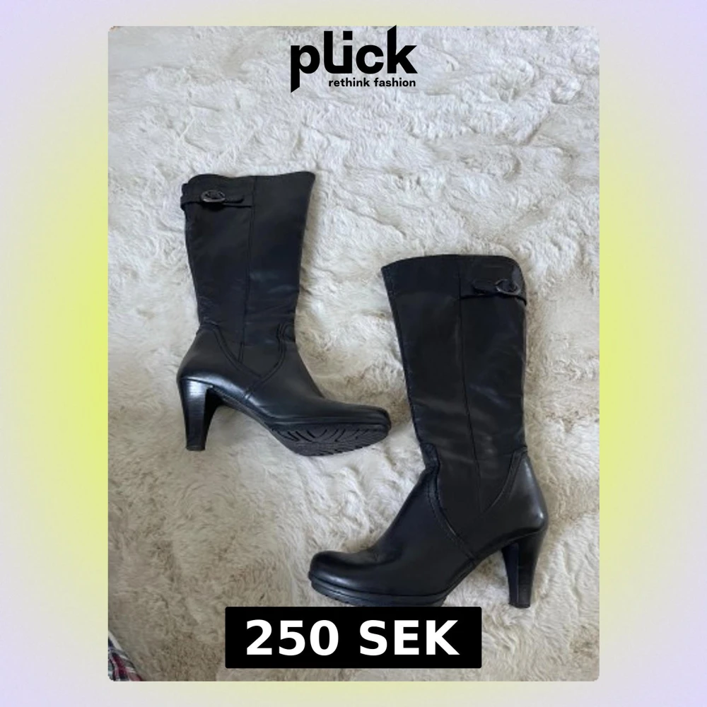 Snygga svarta stövlar från Tamaris i skinn med rund tå och hög klack. Stövlarna har en dekorativ rem med spänne upptill och en plattformsula som ger extra komfort. Köpta på Sellpy men aldrig använda😚💕😇