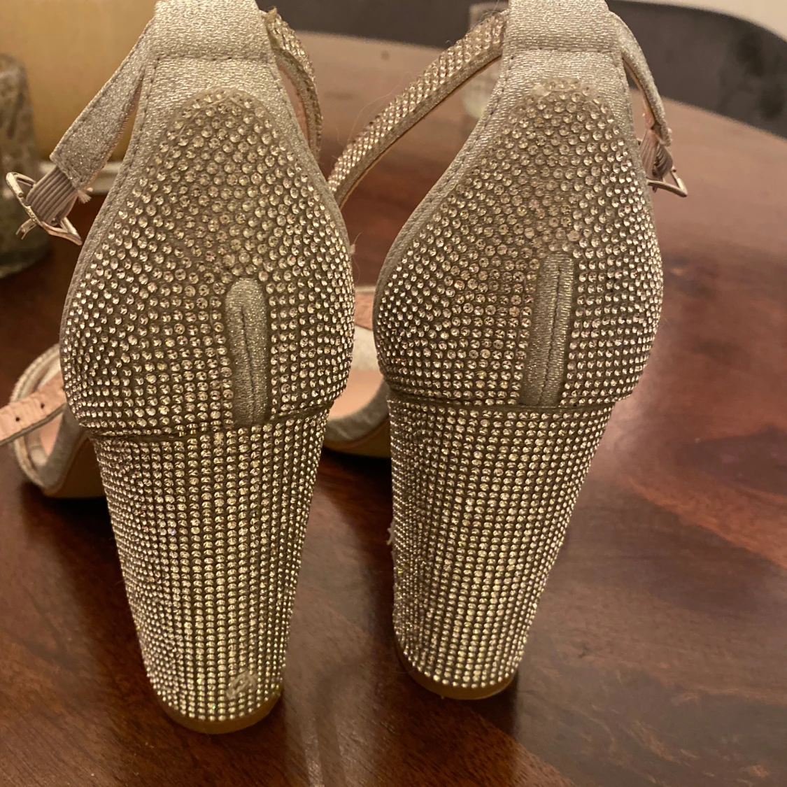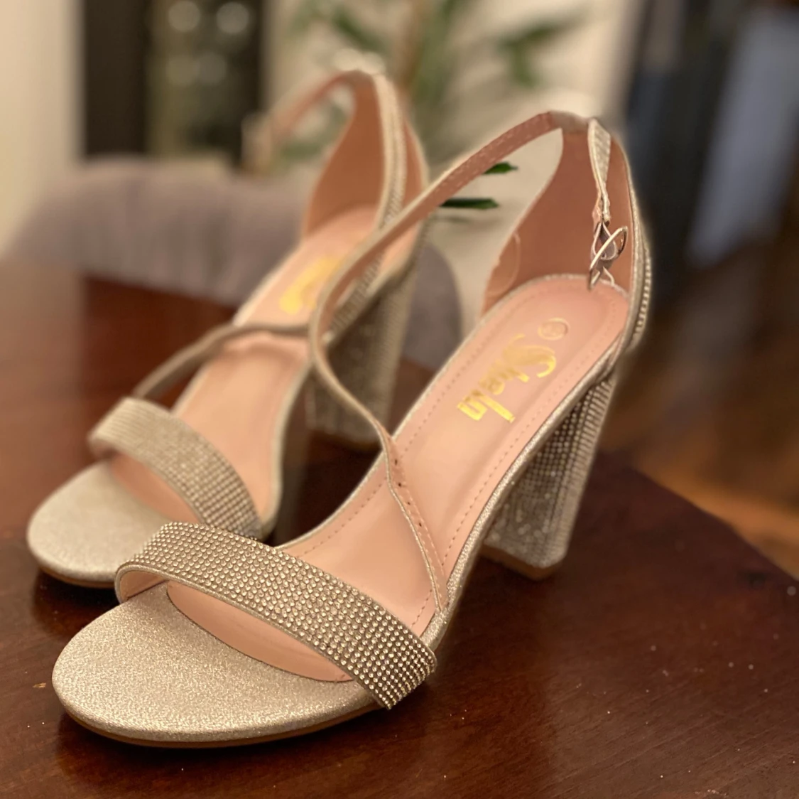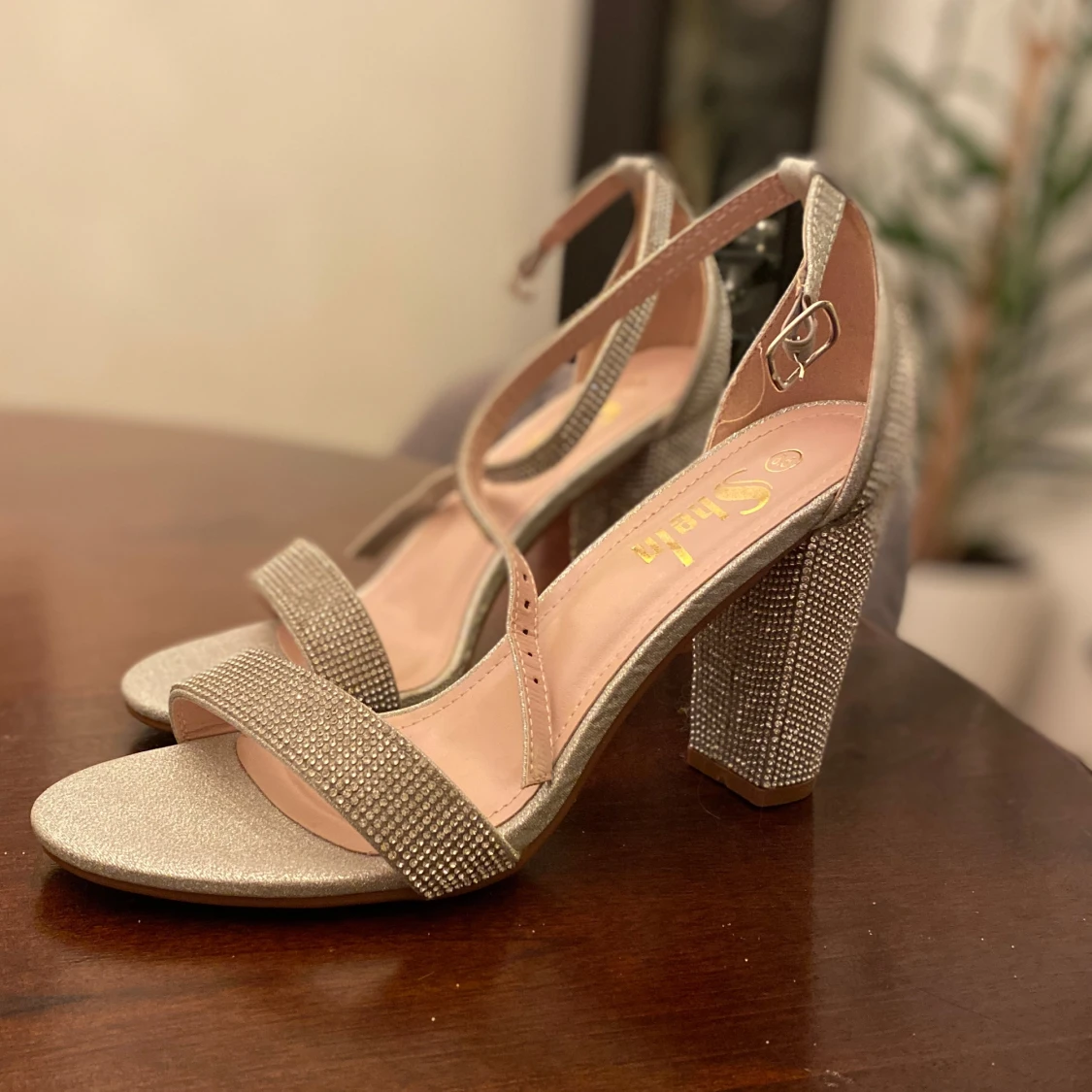 Snygga sandaler med hög klack i glittrigt material. De har en elegant remdesign och en justerbar spänne runt ankeln. Perfekta för att ge en touch av glamour till din outfit.