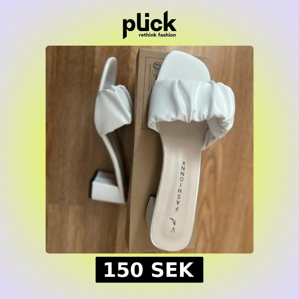 Stilrena vita sandaler med en fyrkantig klack och rynkad remdesign. Perfekta för en elegant look. Sandalerna har en öppen tå och är tillverkade i syntetmaterial. Storlek 39 men passar 38 också!!