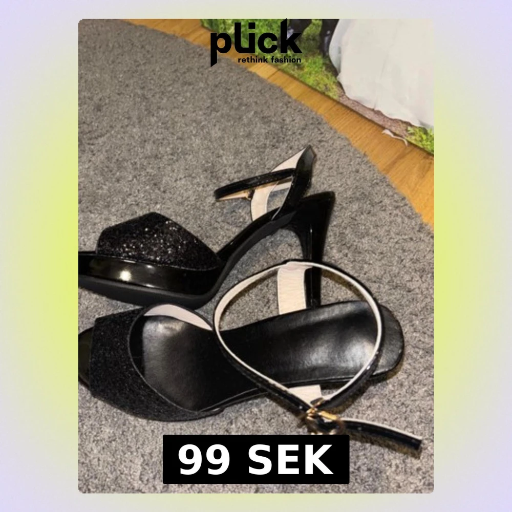 Säljer ett par svarta skor med hög klack och öppen tå. Främre delen har glittrigt material och remmen runt ankeln har ett snyggt spänne i guld. Snyggt lackad finish på klacken och remmarna. Perfekt för dig som gillar att sticka ut med lite extra bling. Storlek 39. De är helt nya
