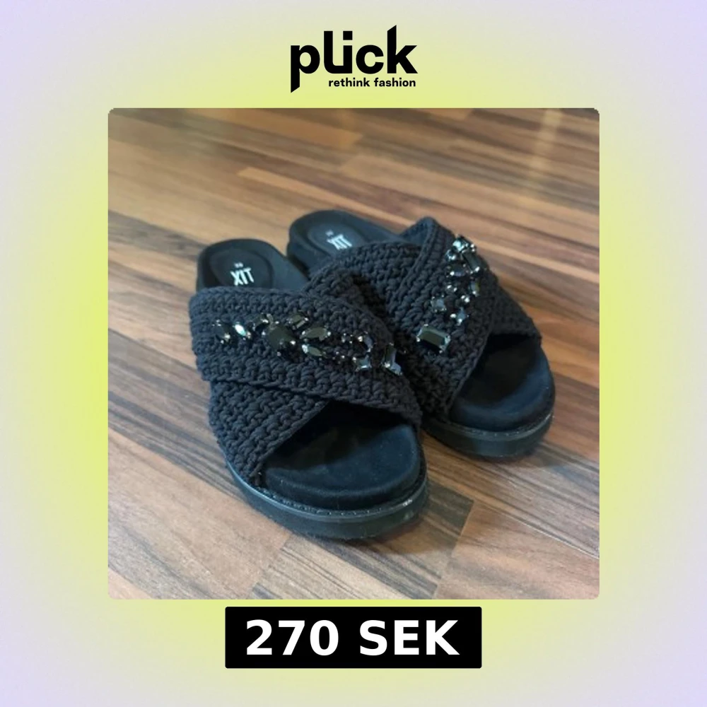 Snygga svarta sandaler från XIT med breda, stickade band i kors och glittrande svarta pärlor och stenar på ovandelen. Skorna har öppen tå och platt sula, perfekt för en cool och avslappnad look. Mjuka innersulor för extra komfort. Använda en gång. En sten som sitter lite löst men går att åtgärda.