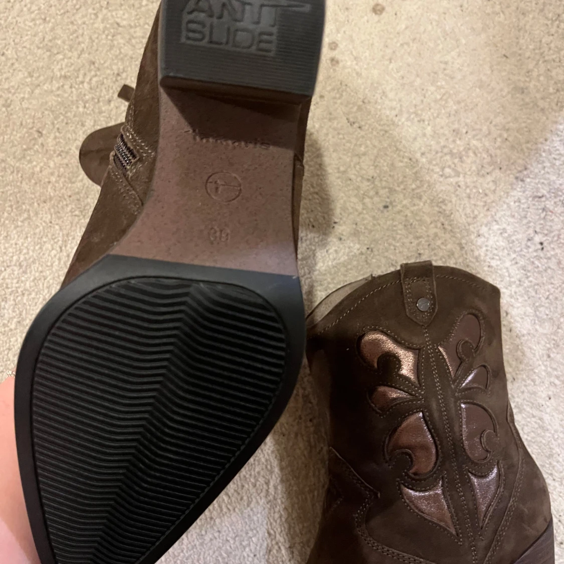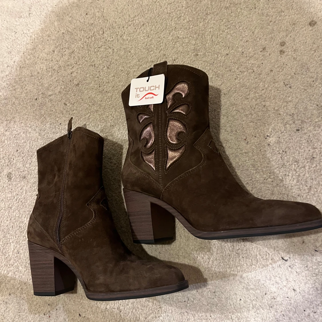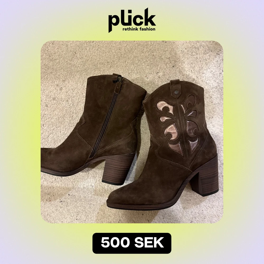 Snygga bruna cowboy boots i mocka med en dekorativ broderad detalj på sidan. De har en bekväm klack och dragkedja för enkel på- och avtagning. Perfekta för en stilren look! Helt nya! Säljer pga har så många boots redan