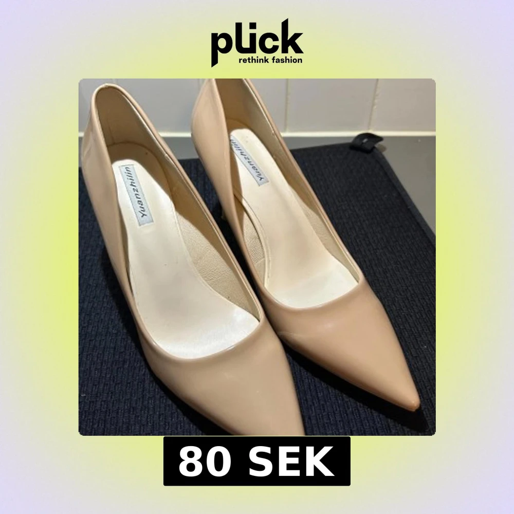 Säljer ett par klassiska beige pumps från Yuanzhilin med spetsig tå och hög klack. Skorna har en elegant och stilren design, perfekta för att lyfta vilken outfit som helst. Tillverkade i syntetmaterial med glansig finish. Använt dom 2-3 gånger bara!