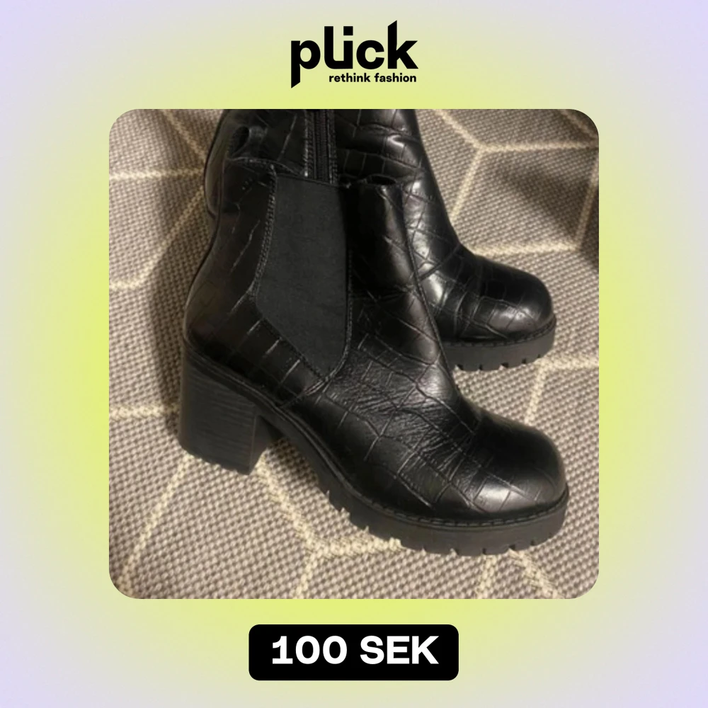 Snygga svarta boots i skinn med krokodilmönster och klack. De har en dragkedja på sidan för enkel på- och avtagning. Perfekta för höst och vinter, dessa boots ger en cool touch till vilken outfit som helst.
