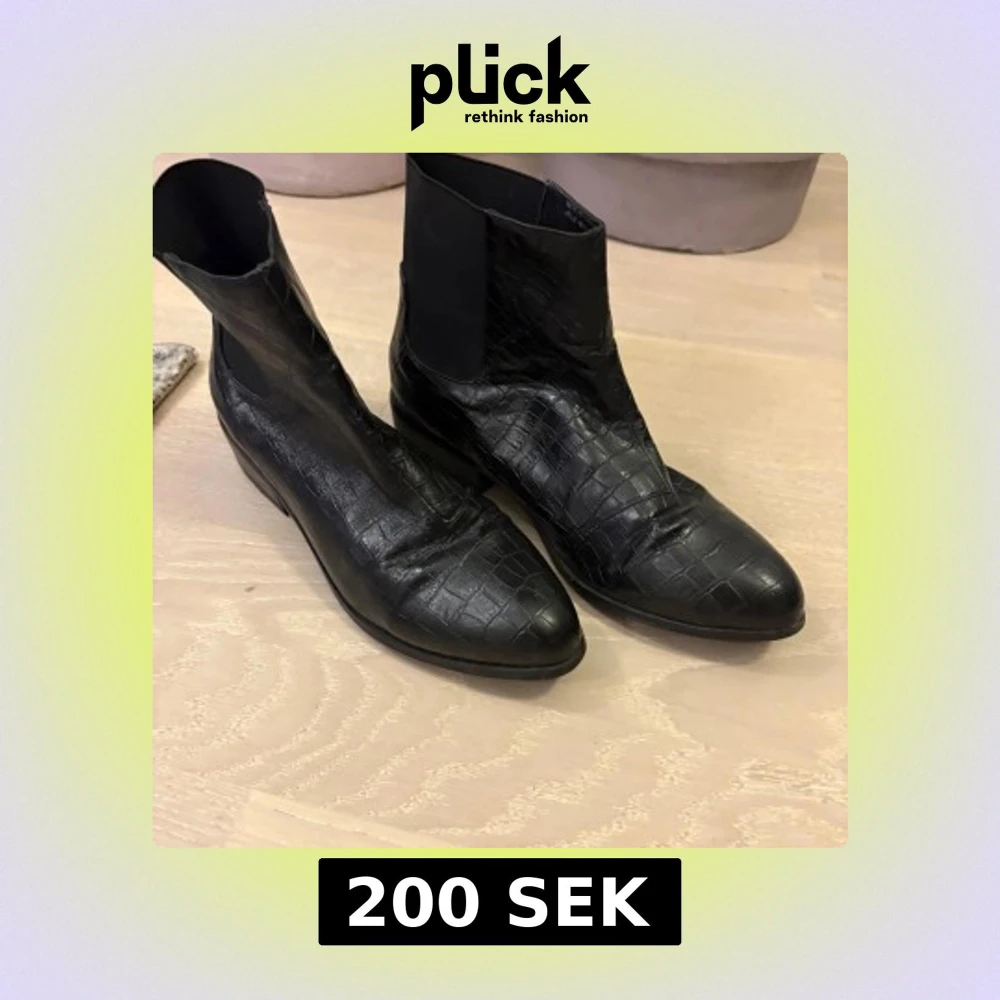 Snygga svarta chelsea boots i crocopräglat skinn med låg klack och rund tå. Elastiska partier på sidorna gör dem enkla att ta på. Är i mycket bra skick
