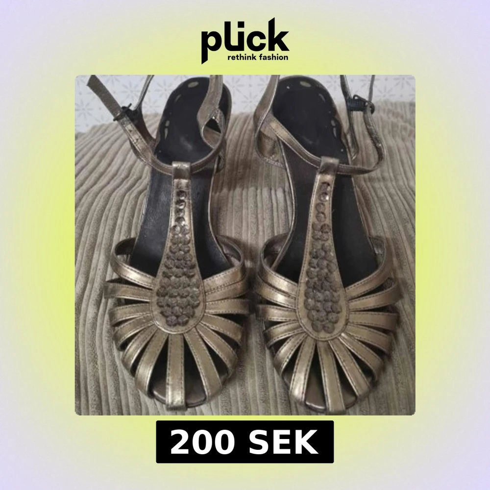 Säljer ett par snygga vintage guldiga finskor med klack . Skorna har dekorativa detaljer framtill och rem runt vristen. Perfekta för dig som vill sticka ut lite extra!