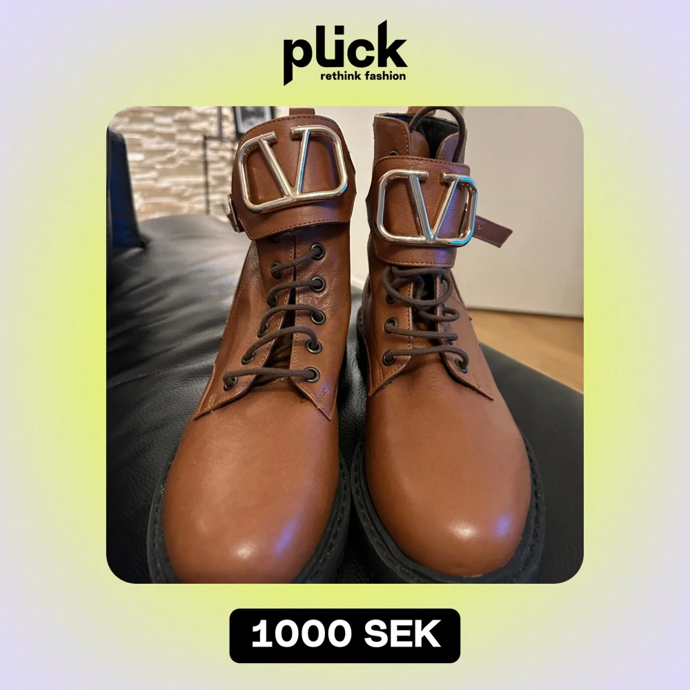 Säljer ett par snygga bruna boots från Valentino i skinn. De har en cool snörning och ett stort V-spänne i guld på framsidan. Perfekta för höst och vinter med sin robusta sula. Använd dem för att ge din outfit en lyxig touch!