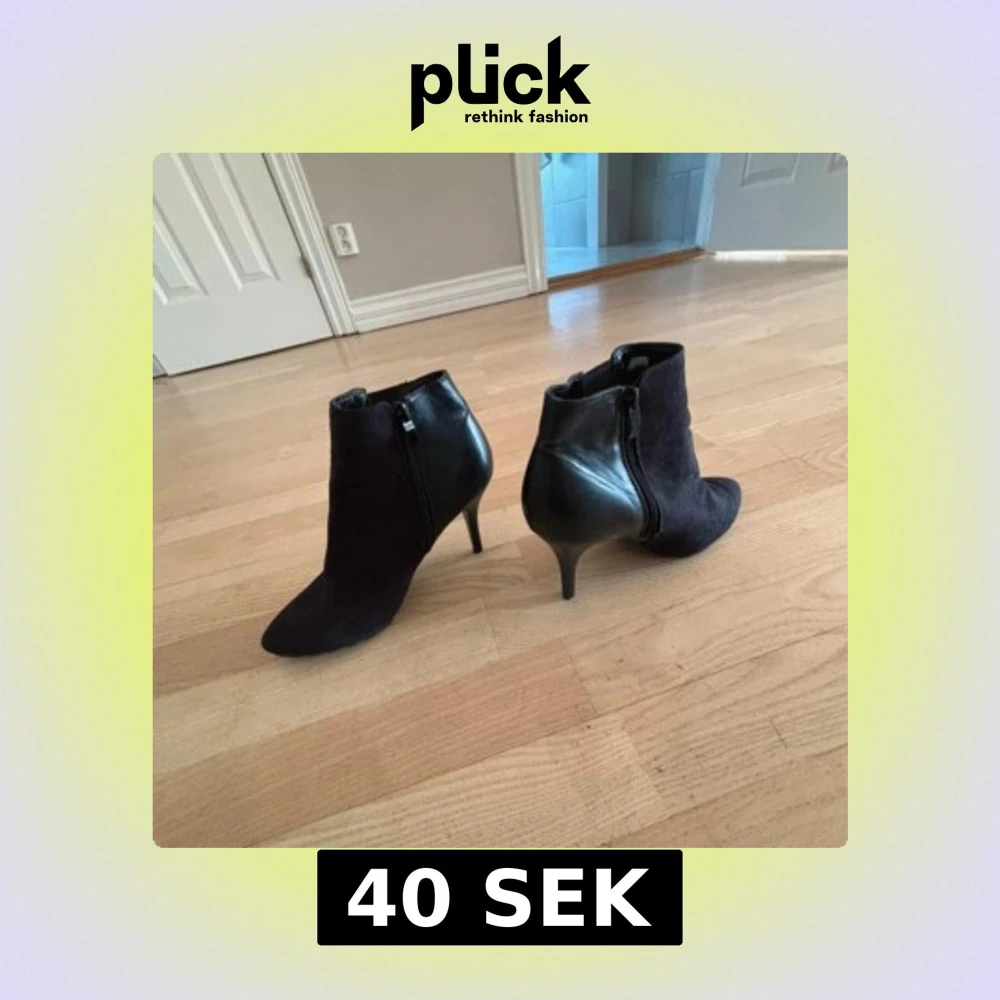 Säljer ett par svarta stövletter med spetsig tå och smal klack. Skorna har en snygg mix av mocka och skinn, samt dragkedja på sidan för enkel påtagning. Perfekta för dig som vill ha en stilren och trendig look.
