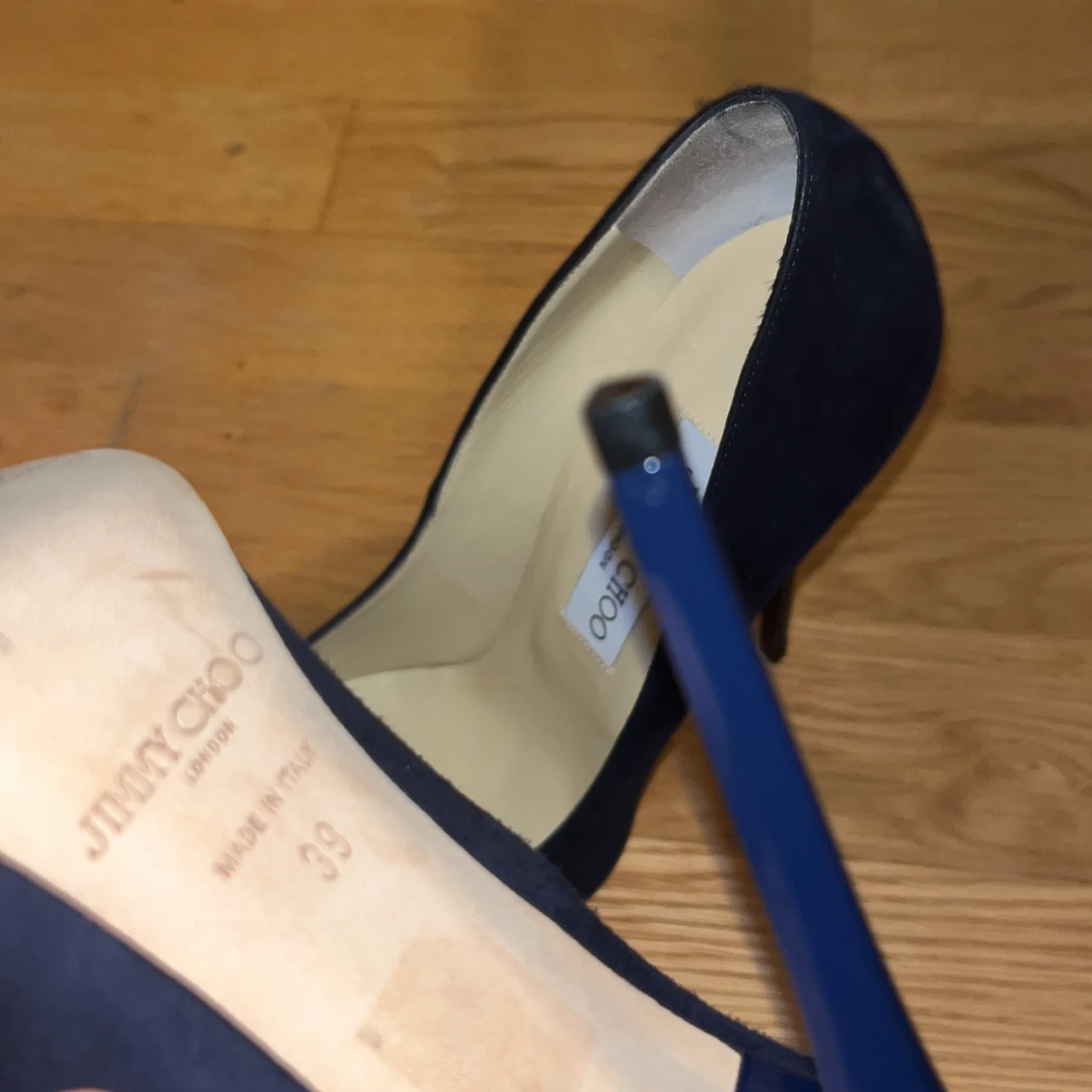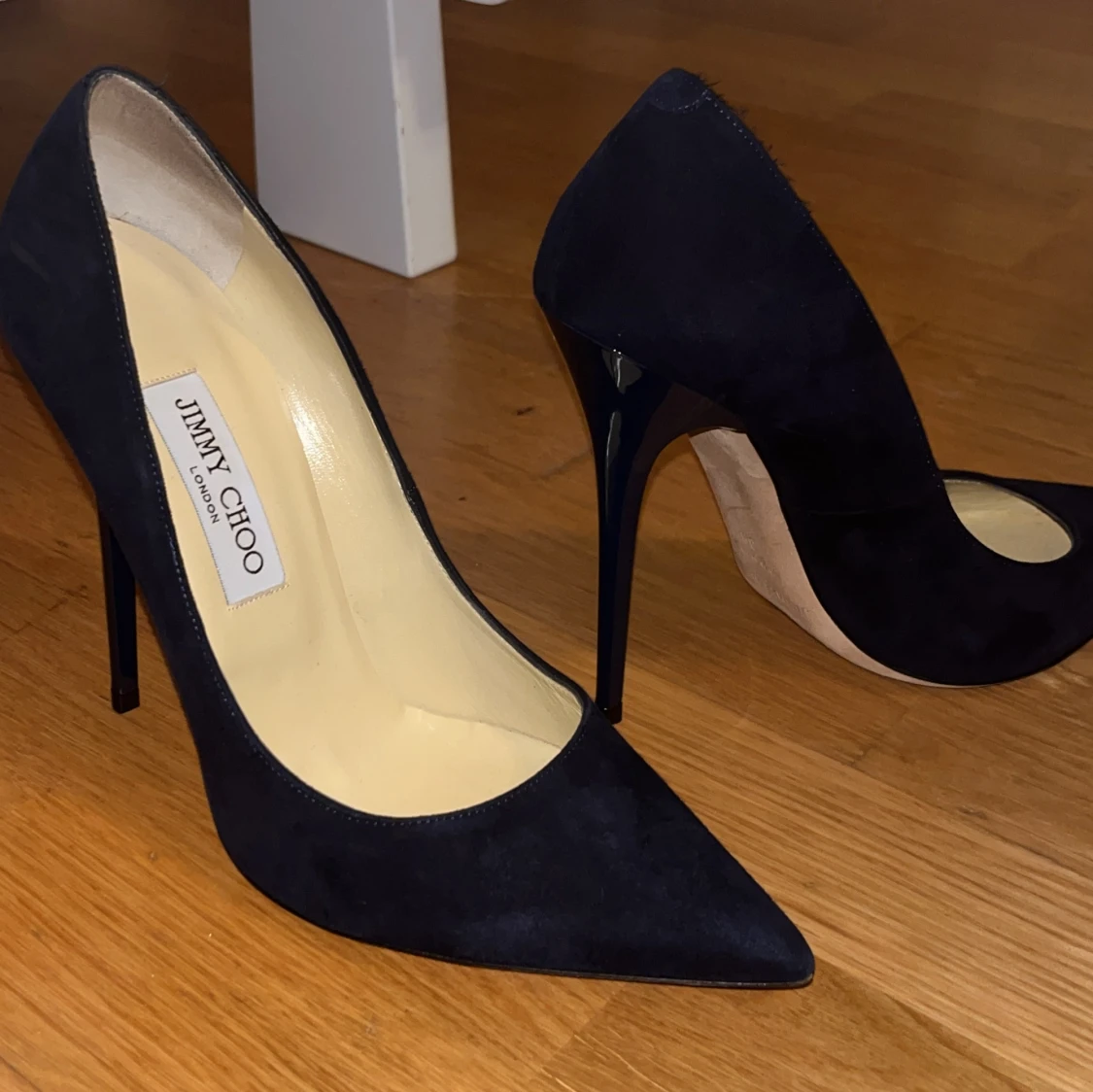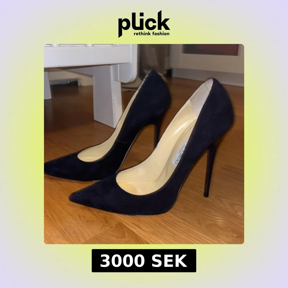 Säljer ett par eleganta klackar från Jimmy choo i mörk mörk blå mocka. Har endast använt 1 gång i ca 1 timme. Dom är sköna om du är van att gå i klackar.