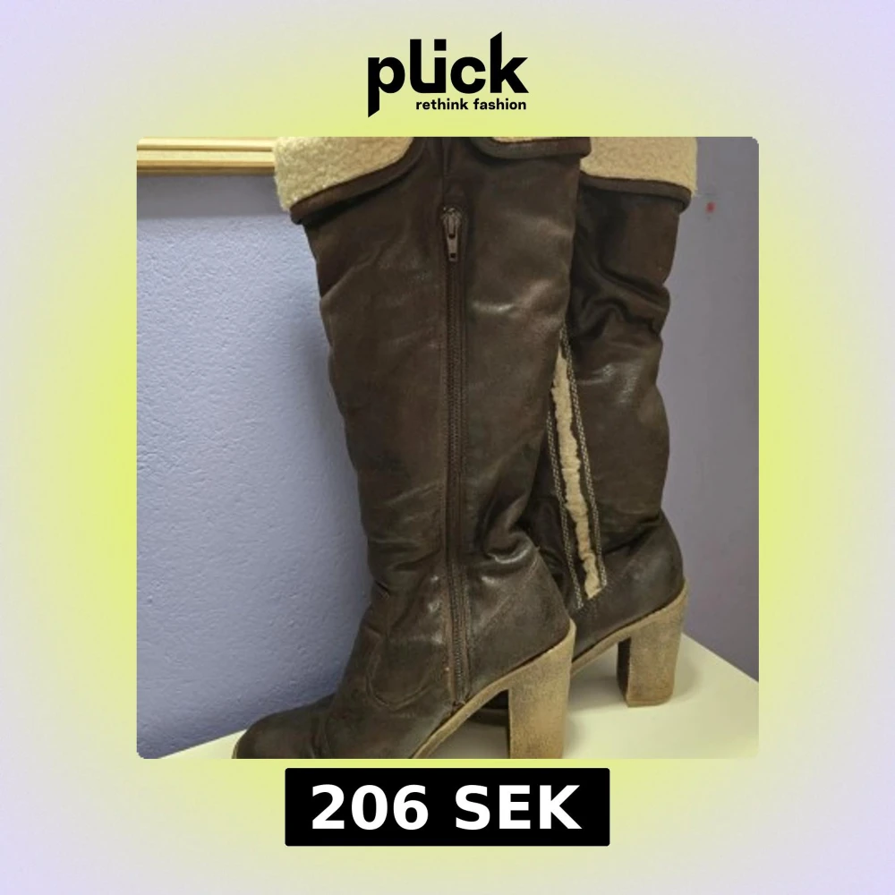 Snygga höga stövlar i mörkbrunt skinn med beige foder och dekorativ söm längs skaftet. Klackad modell med rund tå och dragkedja på sidan. Perfekt för dig som gillar en rustik och cozy vinterstil.