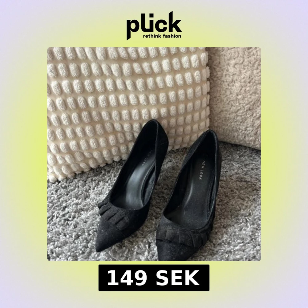 Snygga svarta pumps från New Look i storlek 39. Skorna har spetsig tå, låg klack och är klädda i mocka med dekorativa veck framtill. Perfekta för dig som gillar stilrena och klassiska klackar med en modern touch.