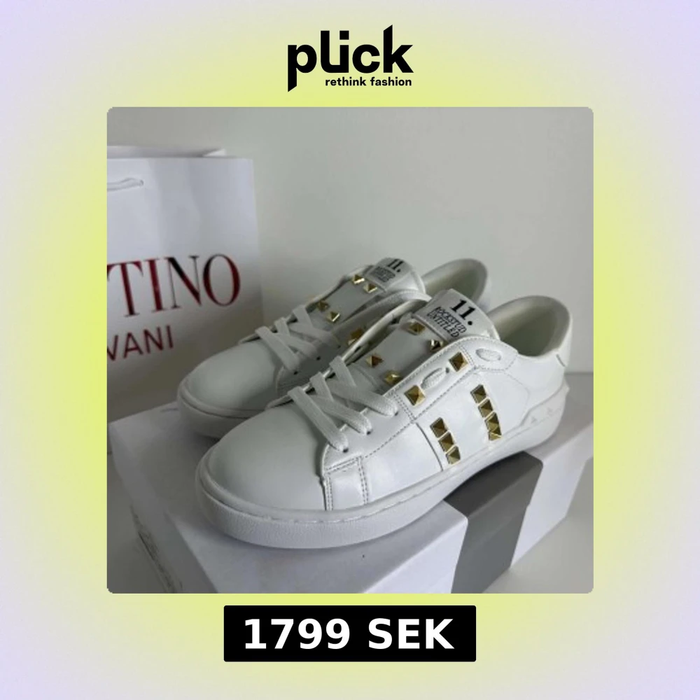 Säljer ett par vita sneakers från Valentino Garavani med ikoniska guldiga nitar längs sidorna och på plösen. Skorna har rund tå, platt sula och är tillverkade i skinn. Perfekta för dig som vill ha en lyxig och trendig look.