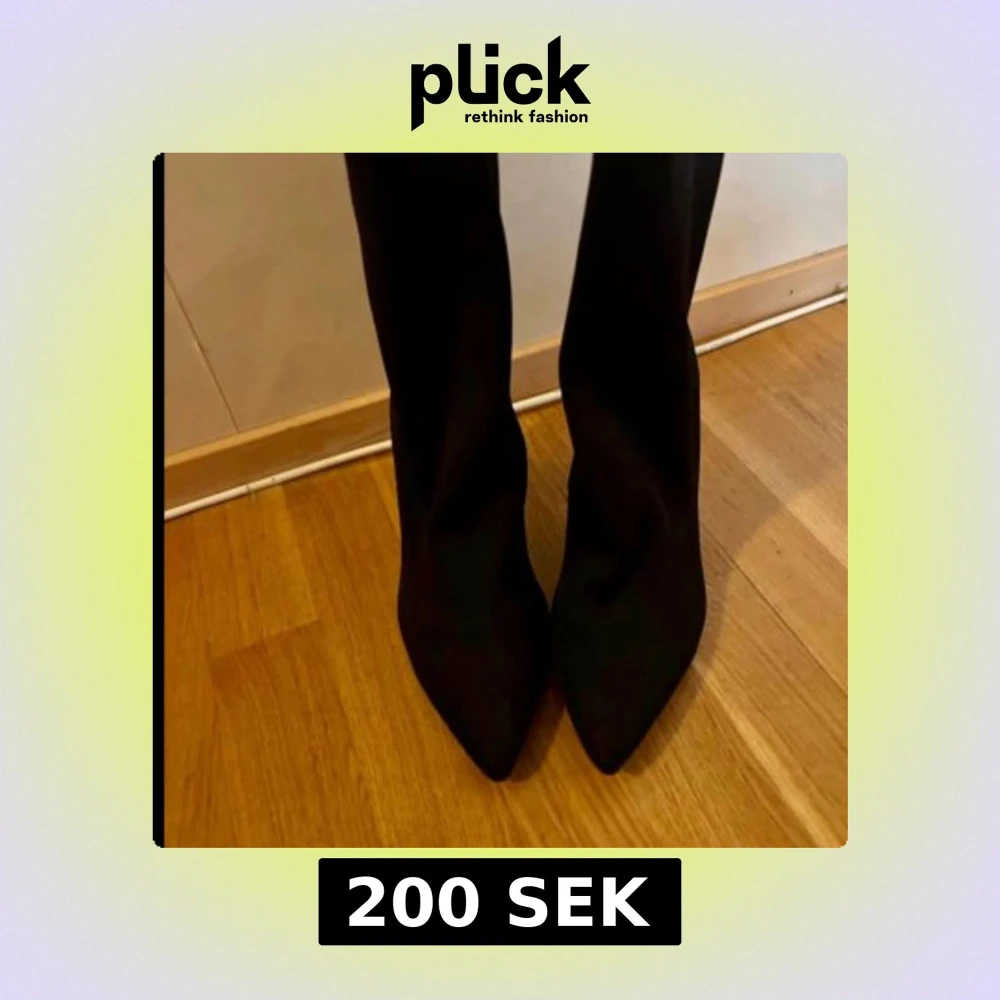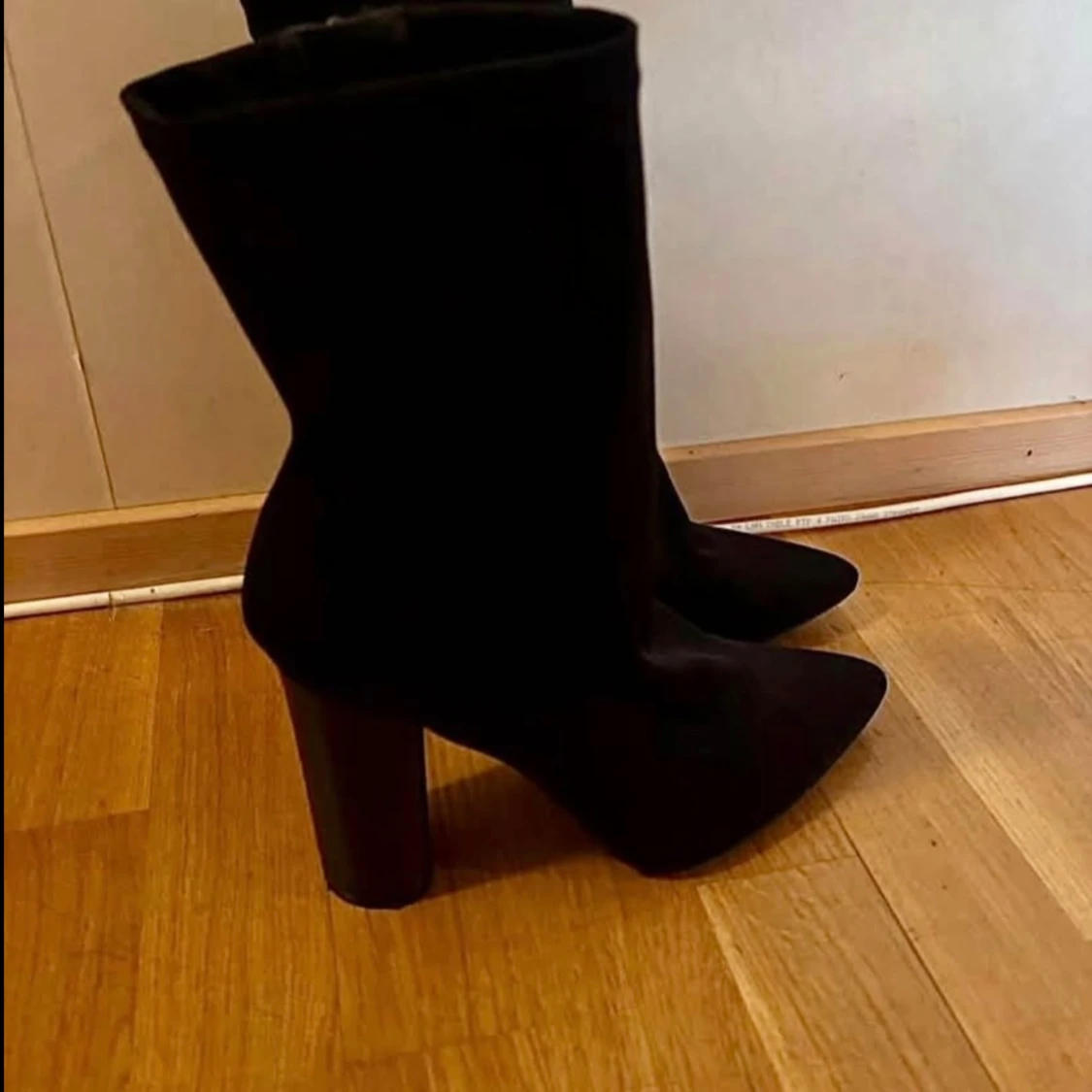 Snygga svarta stövletter med hög klack och spetsig tå. Skorna har en stilren design och är tillverkade i ett material som ser ut som mocka. Perfekta för dig som vill ha en edgy och trendig look.