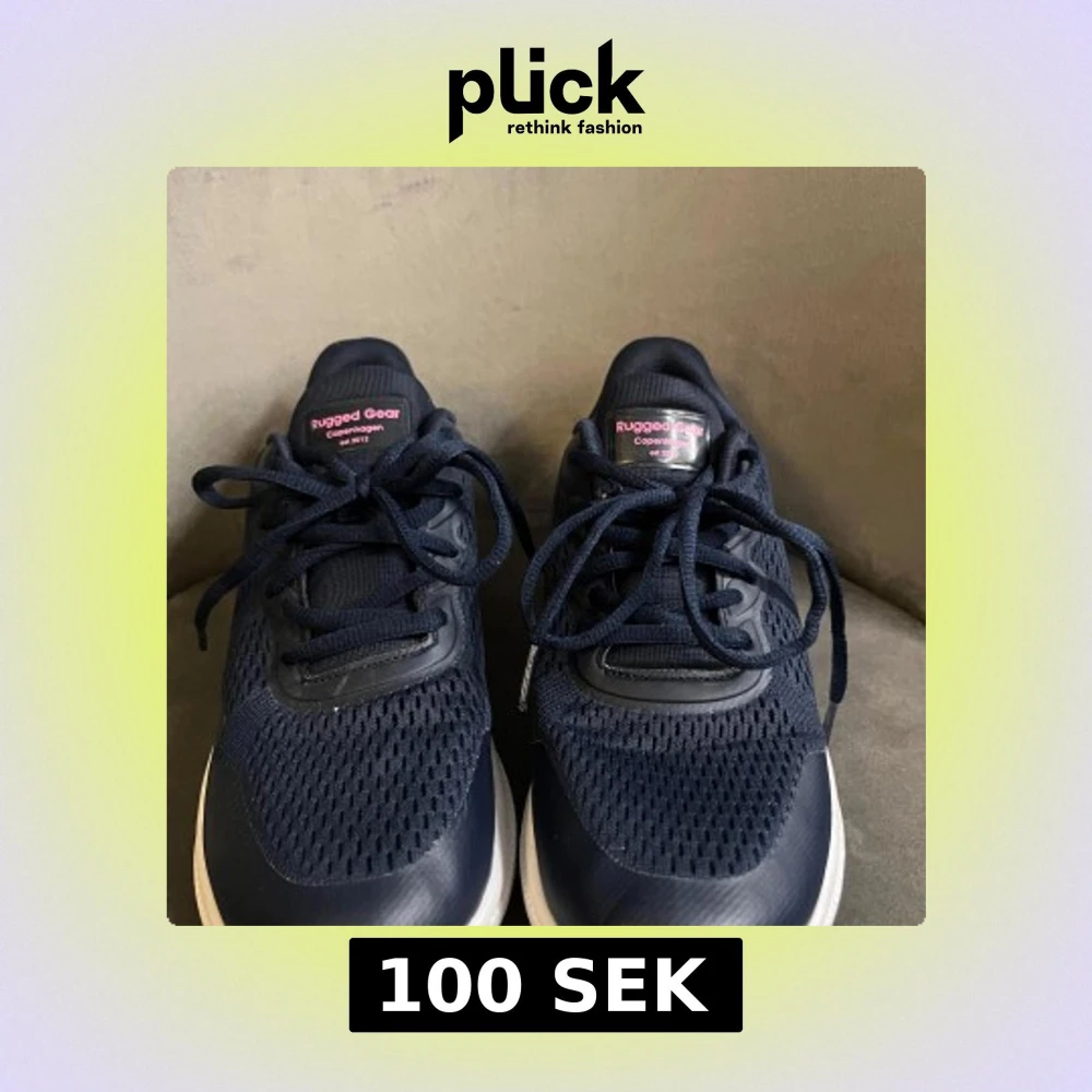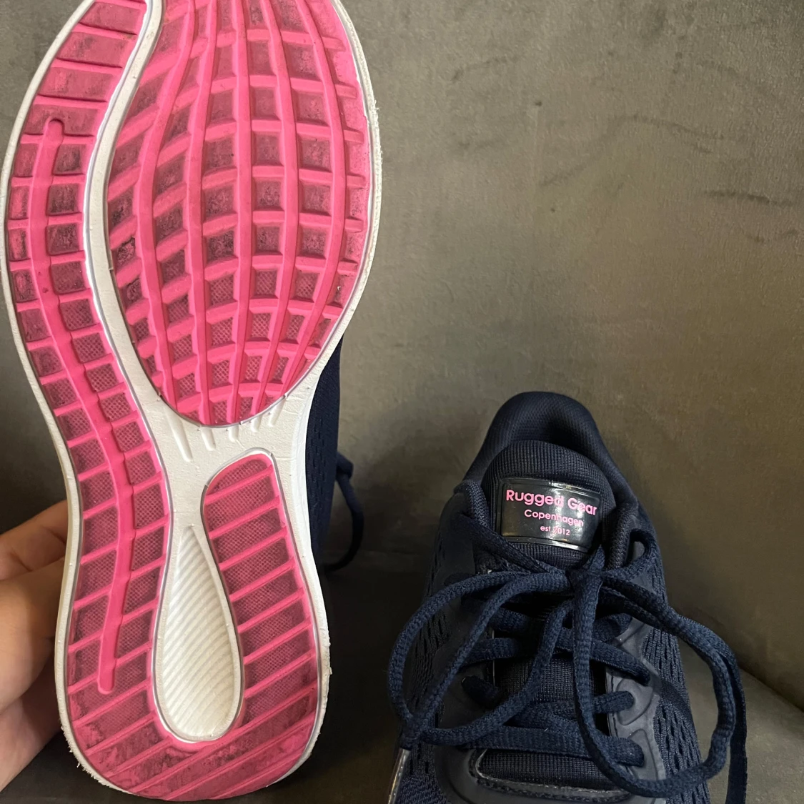 Snygga mörkblå sneakers från Rugged Gear med vit och rosa sula. Ovandelen är i mesh och syntet, vilket ger en sportig vibe. Skorna har snörning och rosa detaljer på häl och sula. Perfekta för dig som gillar stilrena och bekväma sneakers.