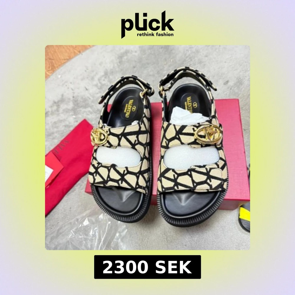 Snygga sandaler från Valentin Garavani i beige och svart med grafiskt mönster och guldfärgade logodetaljer. Skorna har öppen tå, platt sula och justerbar rem med spänne. Perfekta för att lyfta din sommarstil med en lyxig touch.