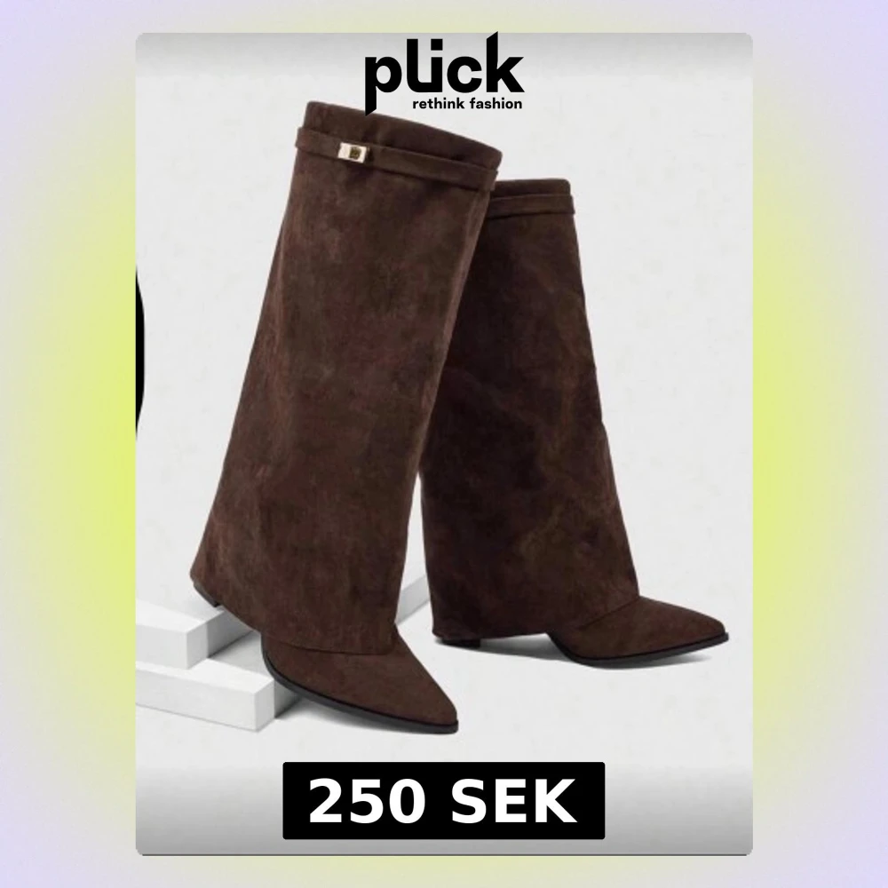 Bruna mockastövlar med spetsig tå - Säljer ett par bruna stövlar i mocka med spetsig tå och låg klack. Stövlarna har en slouchy passform och ett svart band runt vristen som detalj. Perfekta för dig som vill ha en trendig och unik look.