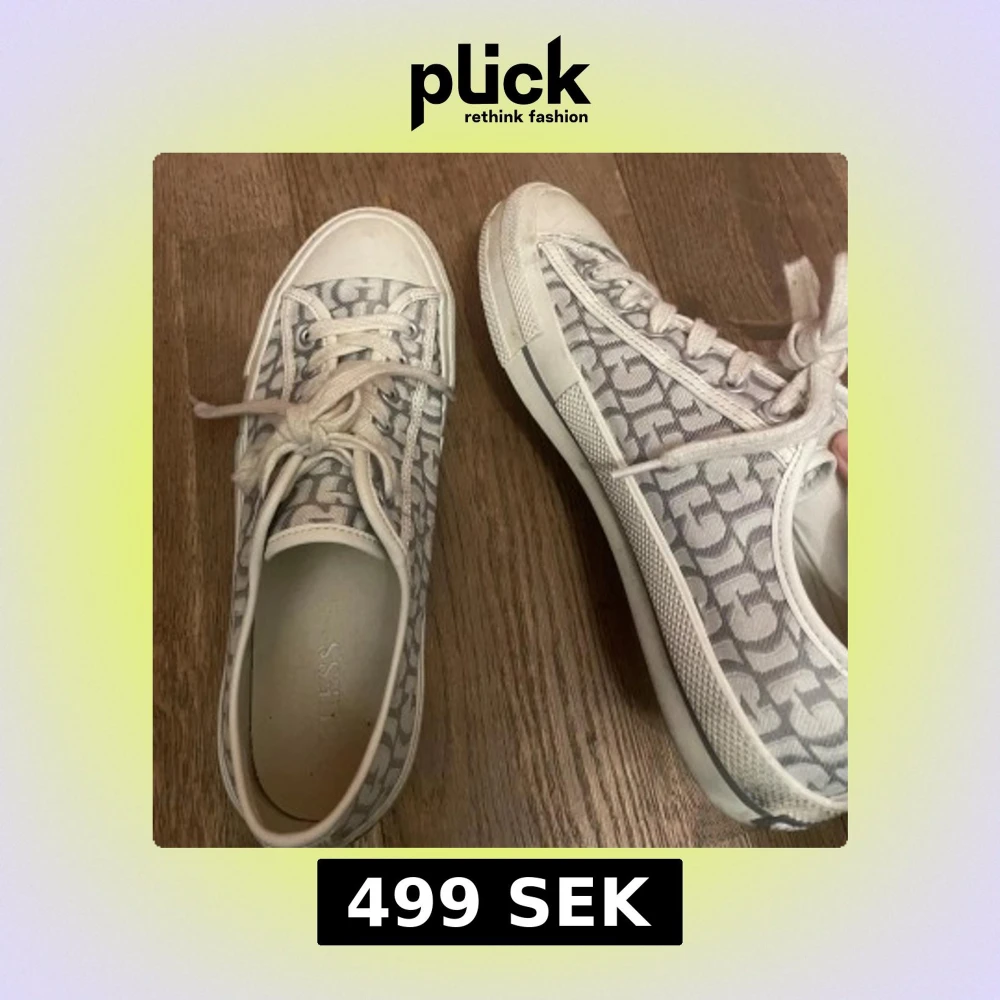 Snygga sneakers från guess med klassiskt monogrammönster i grått och vitt. Skorna har rund tå, platt sula och vita snören. Perfekta för dig som gillar stilrena och trendiga detaljer. Materialet är textil med gummisula. Använda fåtal gånger därav lite smutsiga men går super enkelt att tvätta bort! 💗