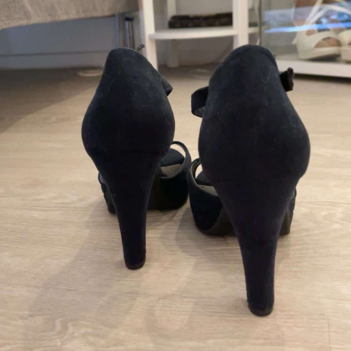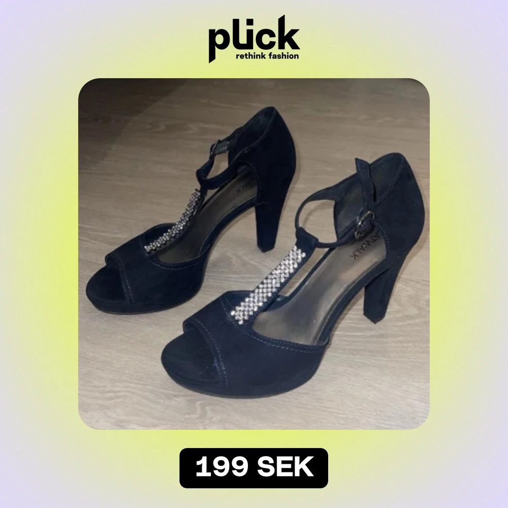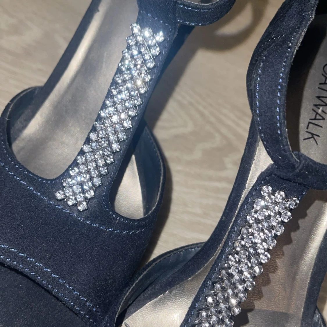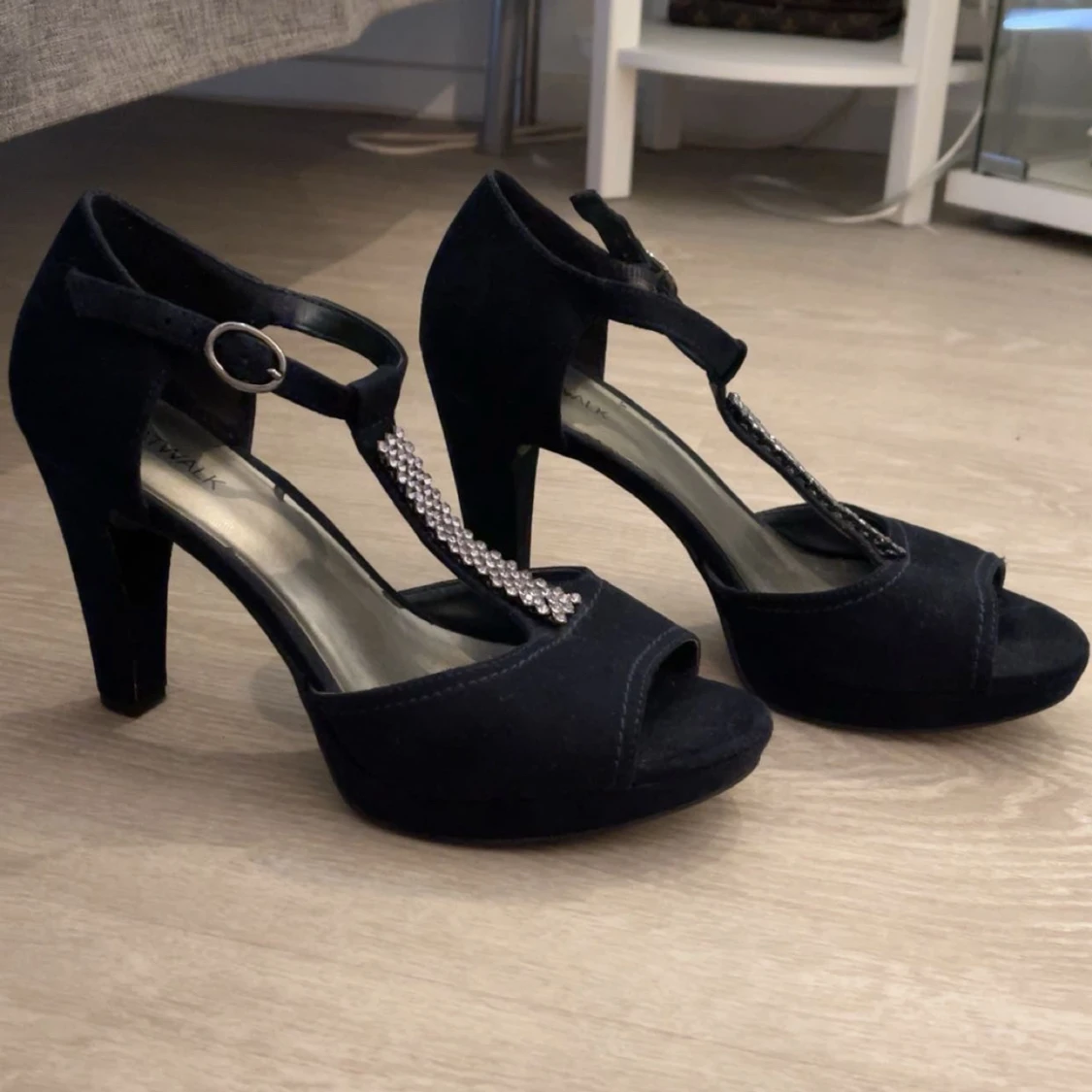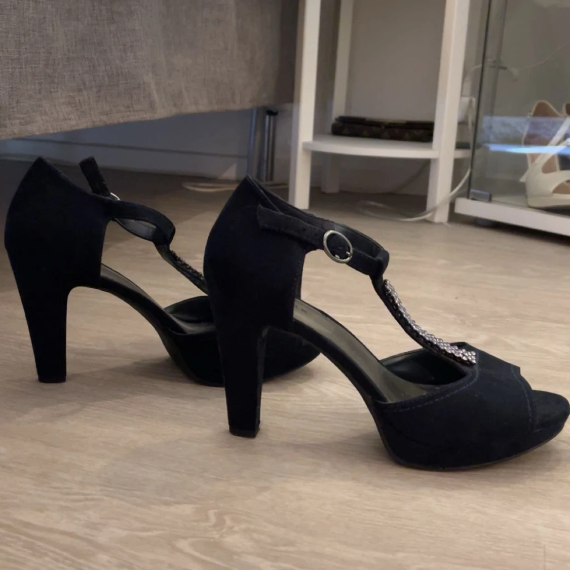 Säljer ett par eleganta svarta klackskor från Catwalk. De är i mocka med en öppen tå och har en snygg rem med strassdetaljer som ger en glittrig touch. Perfekta för festliga tillfällen! Skorna har en bekväm klack och justerbar rem runt ankeln.