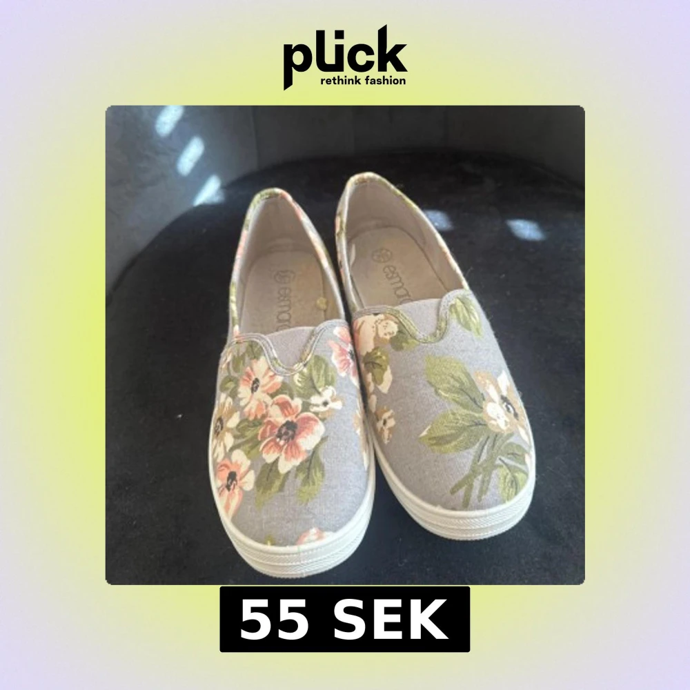 Ballerinaskor från Esmara i grått tyg med blommigt mönster i rosa, grönt och vitt. Skorna har rund tå, platt vit sula. Lätta att ta på och av tack vare slip-on-modellen.