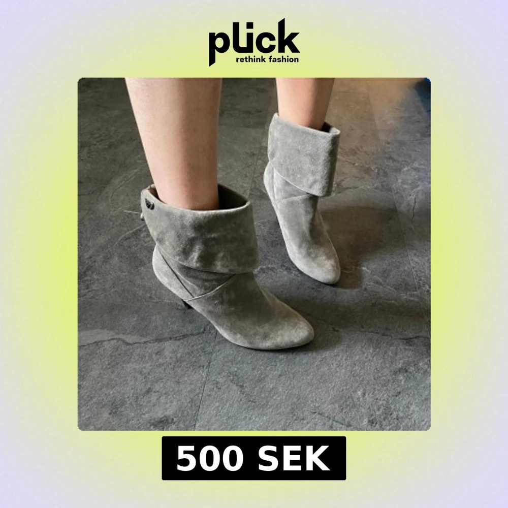 Snygga grå stövletter i mocka med spetsig tå och hög klack. De har en bred, vikt skaftkant och en elegant metallrosett bak. Perfekta för dig som vill ha en stilren och trendig look.