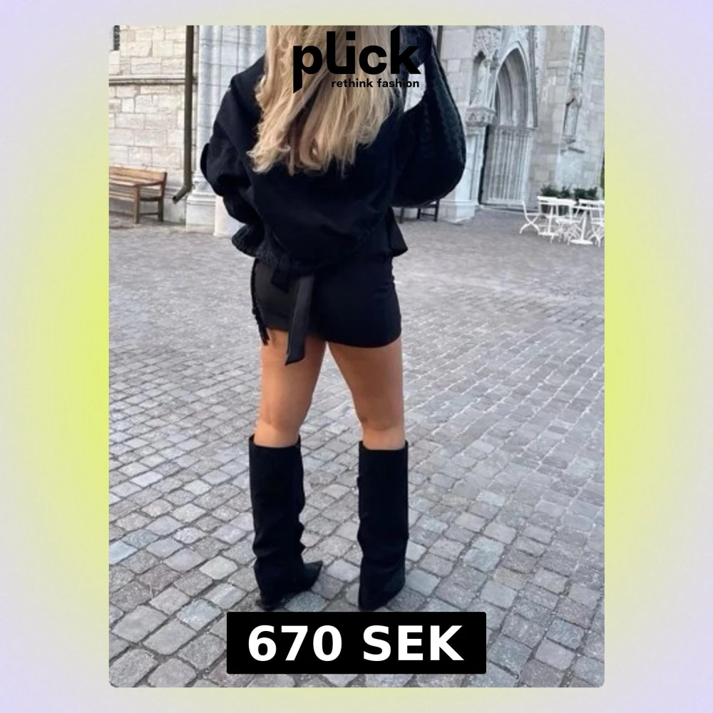 Säljer ett par svarta stövlar i mjuk mocka med hög klack och spetsig tå. Stövlarna har en slouchy passform och når upp till knäna, vilket ger en cool och trendig look. Perfekta att styla med kjol eller shorts för en edgy vibe. Helt nya med lådan kvar!❤️ Nypris 700-800kr