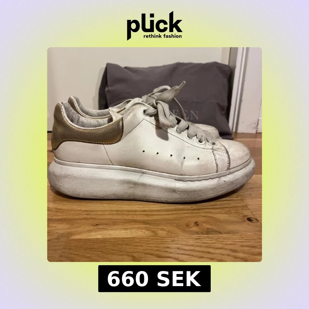 Oversized sneakers från Alexander McQueen med guldetaljer baktill. Som syns på bilderna är de väldigt smutsiga men bortsett från förslitningar i hälen och repor vid tårna och baktill är de hela! Priset reflekterar skicket men tror att en skomakare skulle kunna göra underverk! (Ex. Hallmans skomakeri på NK är duktiga på att återställa märkesskor) Skicka ett meddelande om du undrar något! Saknar kvitto men har skornas serienummer.