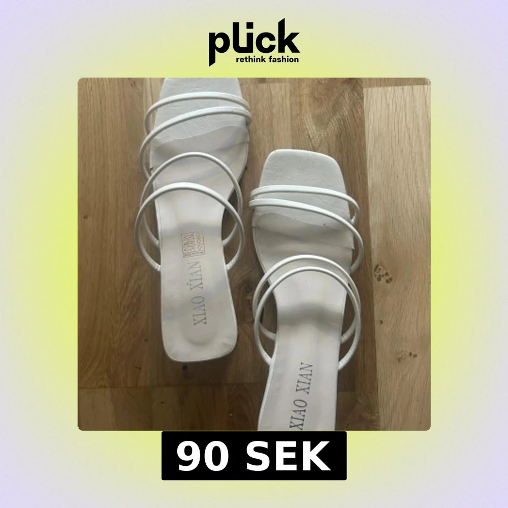 Snygga vita sandaler med flera tunna remmar och fyrkantig tå. De har en låg klack och öppen design, storlek 39. Använda 1 gång