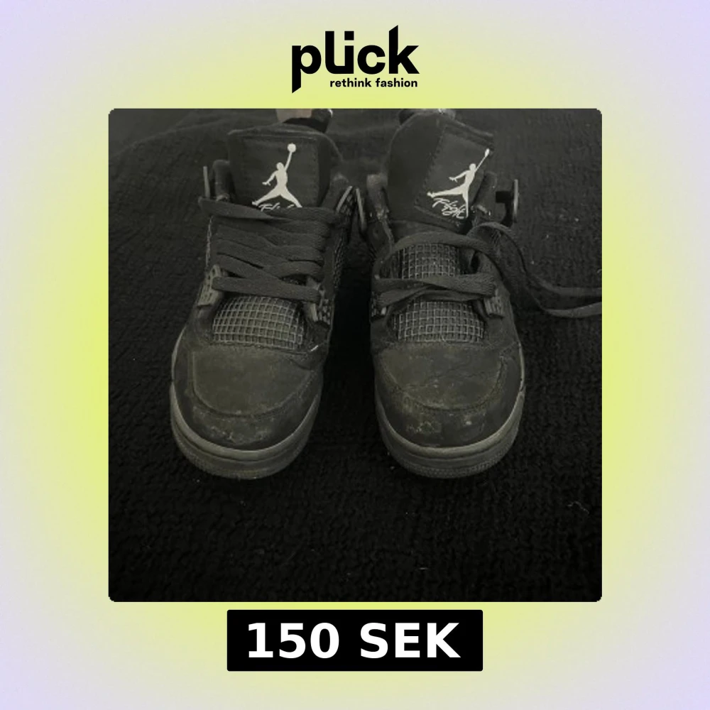 Säljer ett par helsvarta Nike Air Jordan 4 sneakers med klassisk meshpanel, coola detaljer och Jumpman-logga både fram och bak. Skorna har snörning och en chunky sula med synlig luftbubbla. Perfekta för dig som gillar streetstyle och vill sticka ut. Lite slitna och saknar en skosnöre på ena skon annars väldigt bra plagg att ha för streetwear