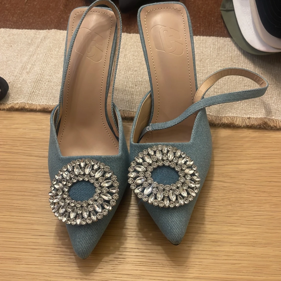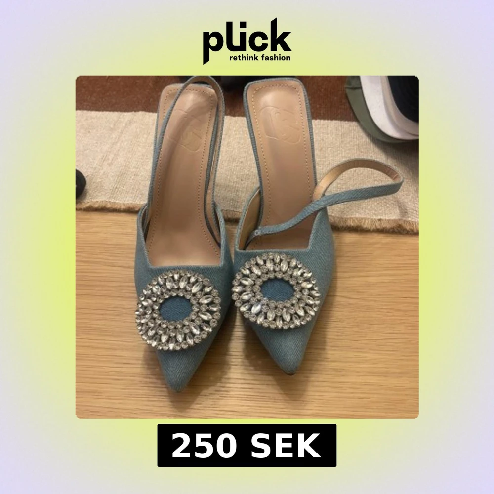 Eleganta blå pumps med spetsig tå och en stor glittrig strassdetalj framtill. Skorna har en smal rem runt hälen och är tillverkade i ett jeansliknande material.