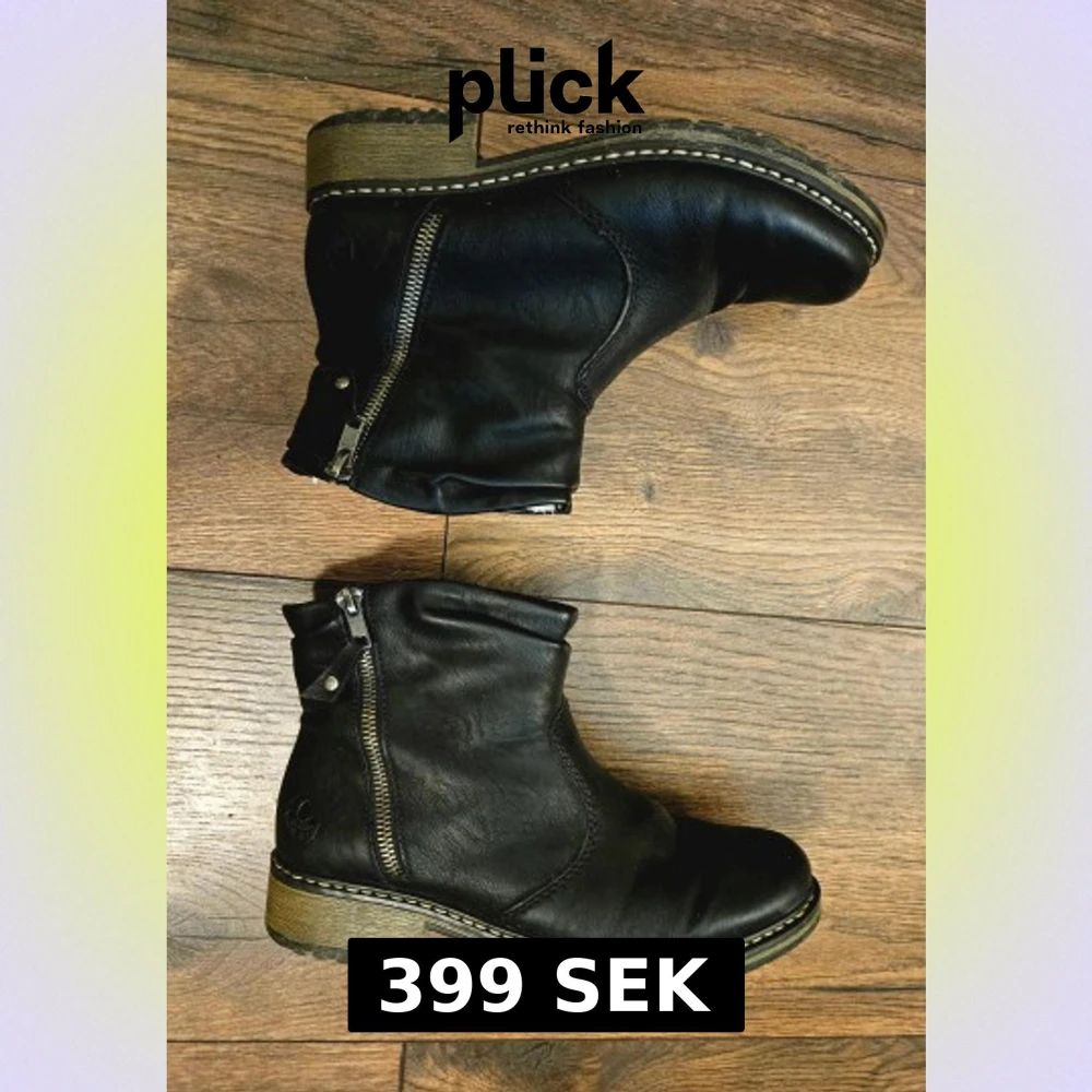 Svarta boots från Rieker med rund tå och grov platt sula. Utsidan är i skinn och insidan är fodrad med mjuk, vit syntetpäls för extra värme. Dragkedja på sidan gör dem enkla att ta på. Snygga kontrastsömmar runt sulan och robust look.