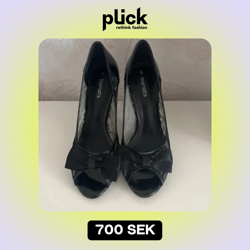 Säljer ett par eleganta svarta klackskor från Barratts. De har en snygg spetsdesign på sidorna och en fin rosett framtill. Skorna har en öppen tå och en smal klack som ger en stilren look. Perfekta för festliga tillfällen!