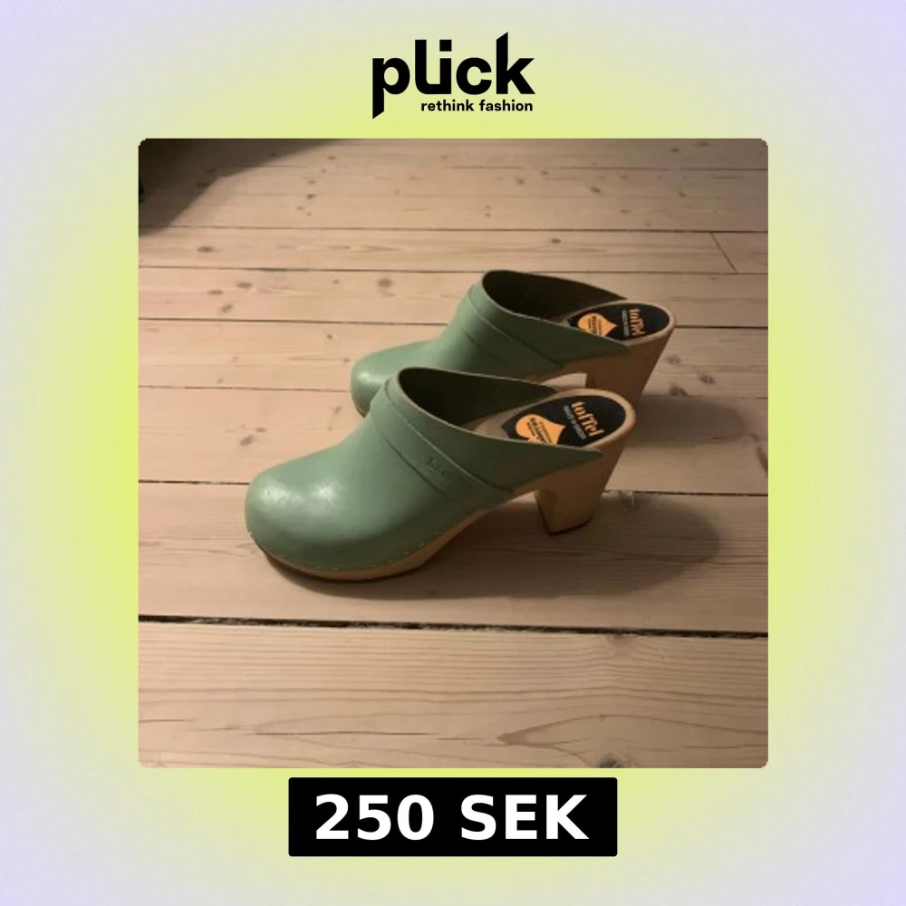 Fina mintgröna träskor med klack från Swedish hasbeens. Storlek 39. Använda men i gott skick. Skickar gärna fler bilder vid förfrågan.