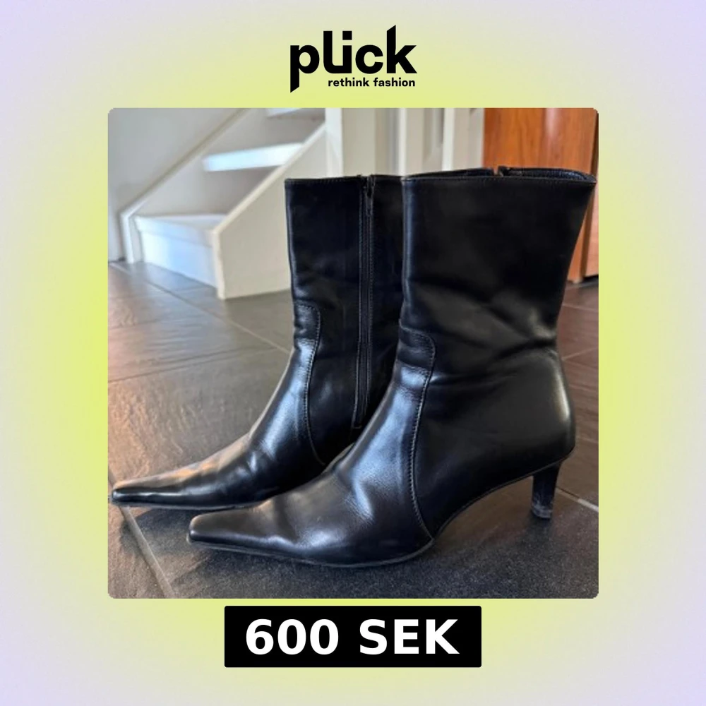 Snygga svarta Italienska stövletter i skinn med spetsig tå och klack. Skorna har dragkedja på sidan för enkel påtagning och en stilren, minimalistisk look som passar till många outfits. Perfekta för dig som gillar klassisk men edgy stil. Sparsamt använda.! Passar på en 38:a
