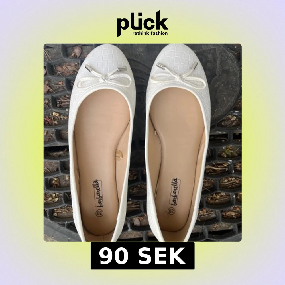 Snygga vita ballerinaskor från Barbarella med flätad struktur och söt rosett framtill med metalländar. Skorna har rund tå och platt sula, perfekta för en clean och fräsch look. Skulle säga att det går mer åt 38/38,5 i storleken