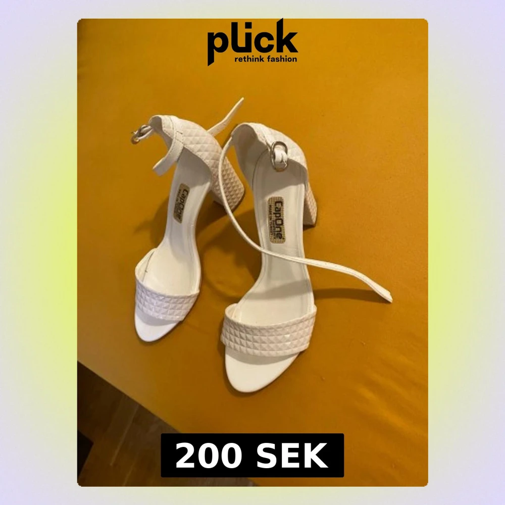 Säljer ett par vita sandaler från Capone i storlek 39. Skorna har en snygg blockklack och ett geometriskt mönster på både klacken och remmarna. Öppen tå och justerbar rem runt ankeln. Perfekta för dig som gillar stilrena detaljer och vill sticka ut.