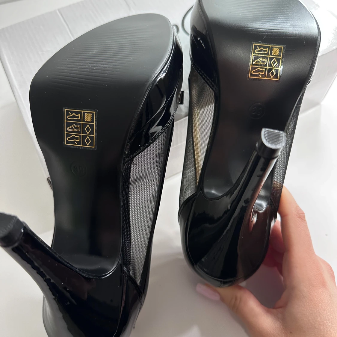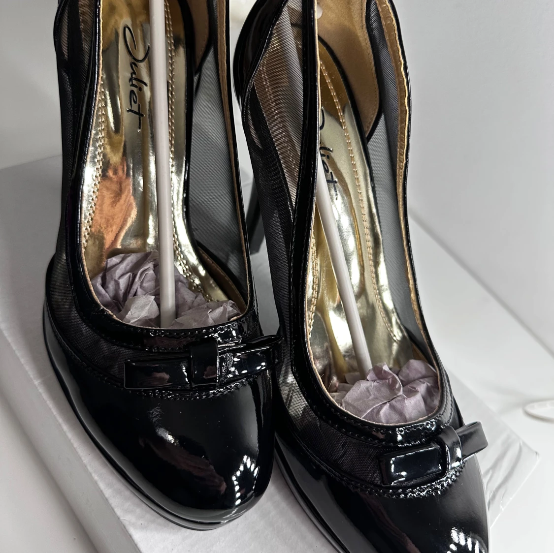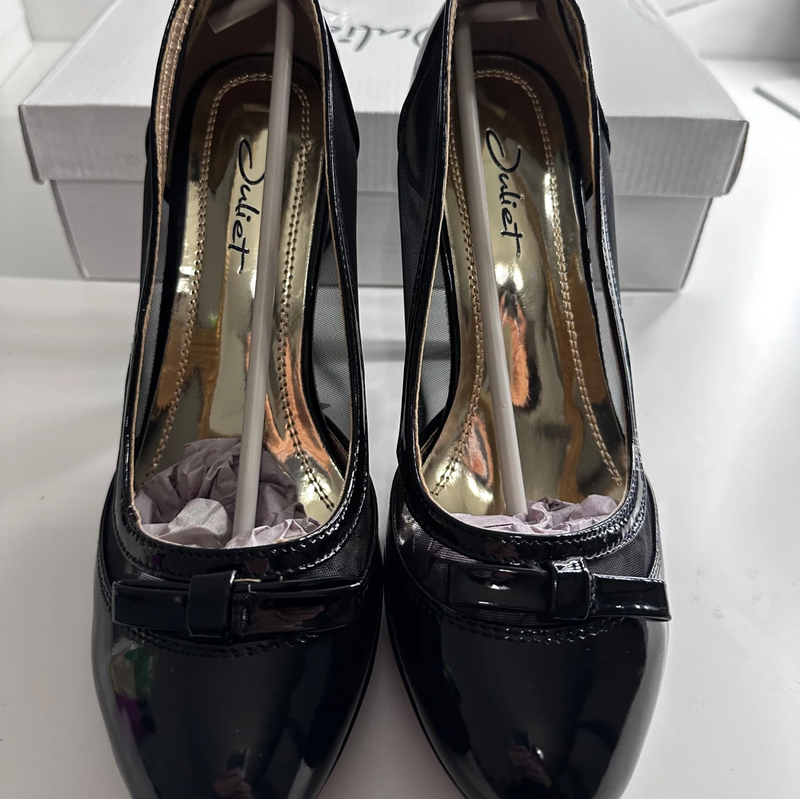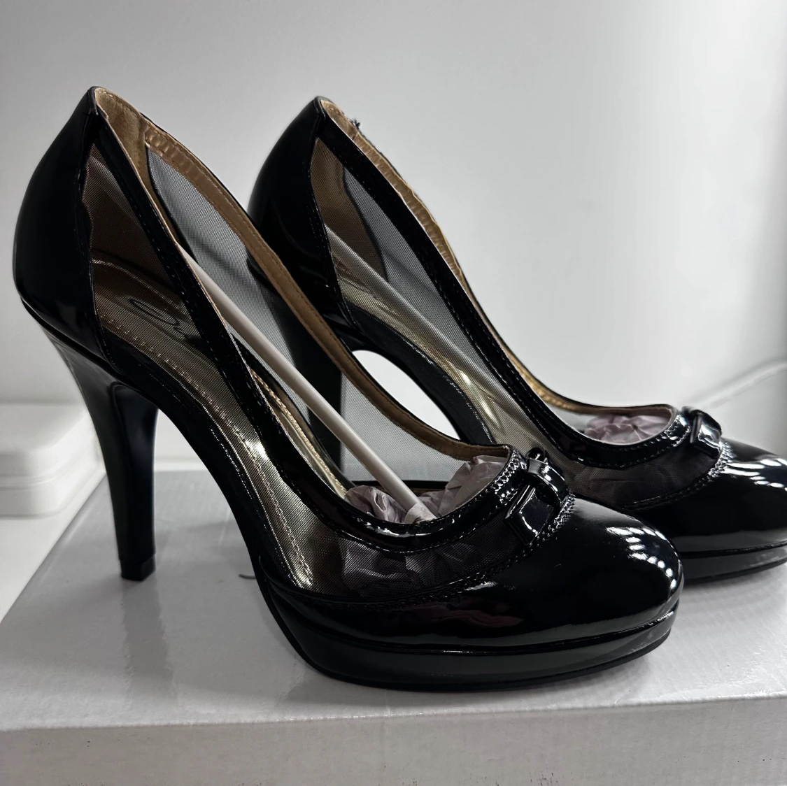 Säljer ett par helt nya eleganta svarta klackar, lackad yta och inslag av mesh på sidorna. Skorna har en dekorativ detalj framtill och rund tå.