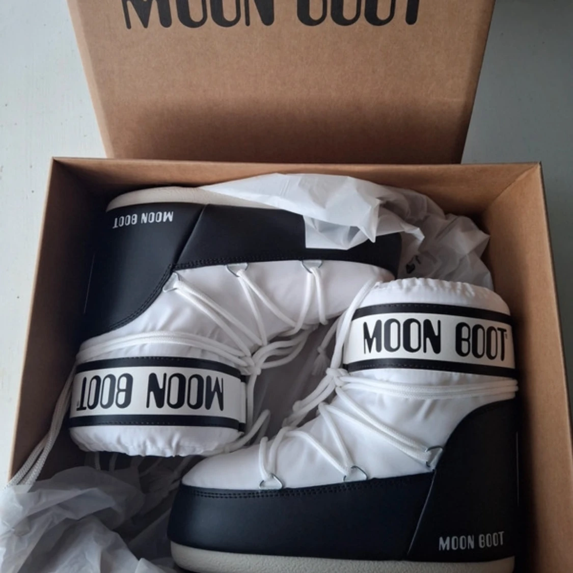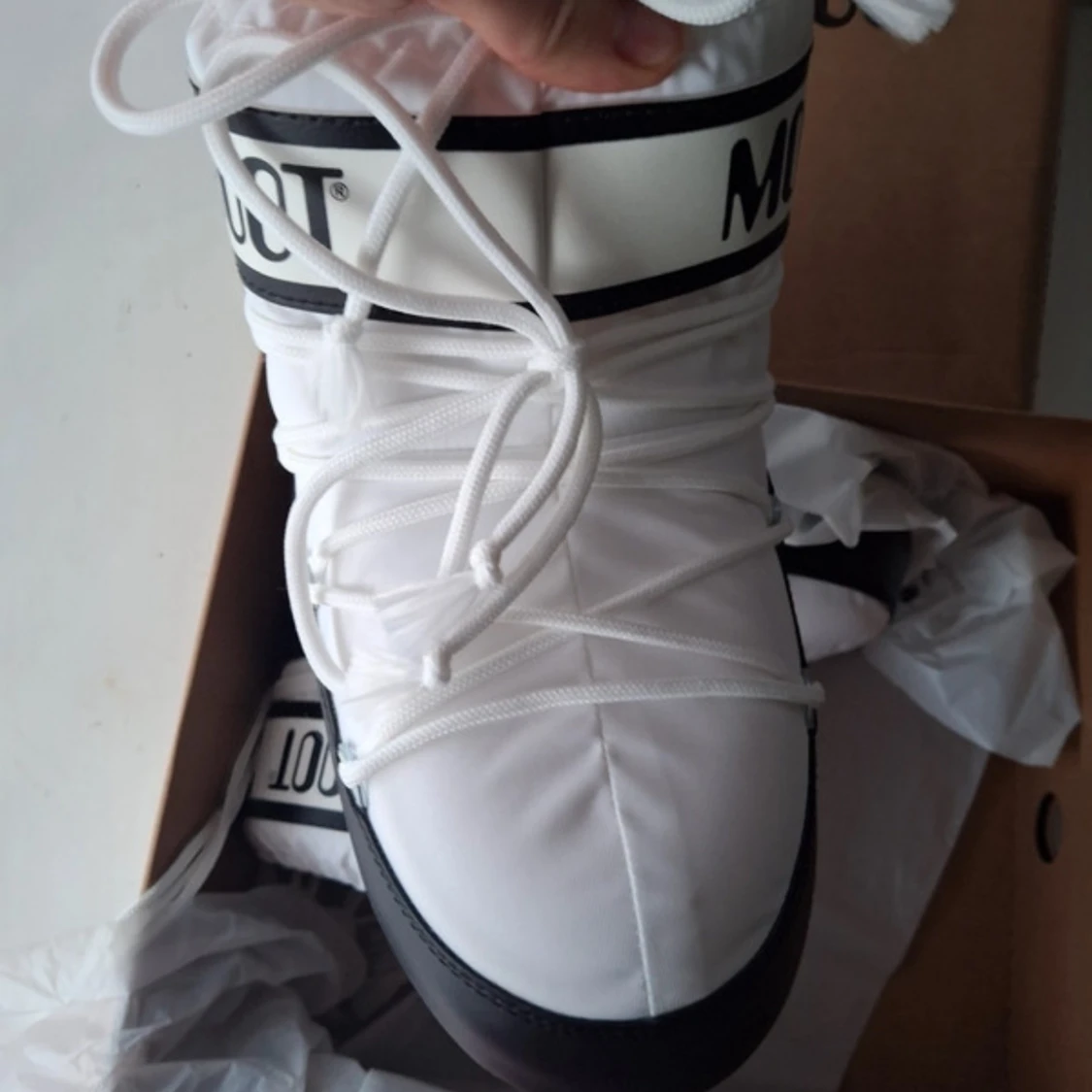 Säljer ett par vita och svarta Moon Boots med snörning. Perfekta för vintern. Har väldigt synliga tecken på användning speciellt på snörningen. Men är i väldigt bra skick, bärda två vintrar. Kan säkert tvättas för finare skick men aldrig testat!