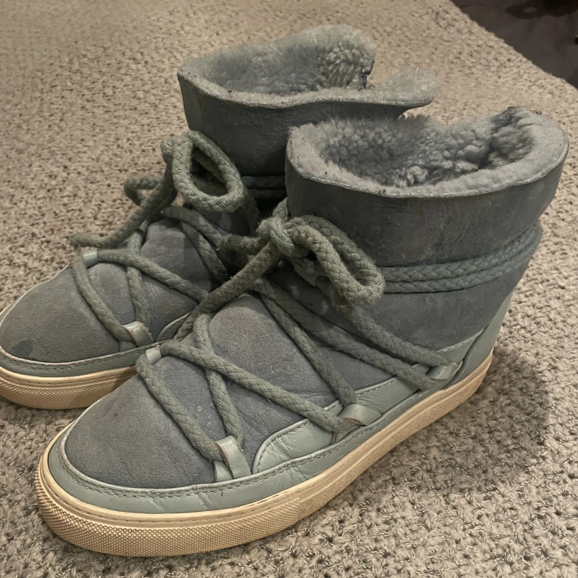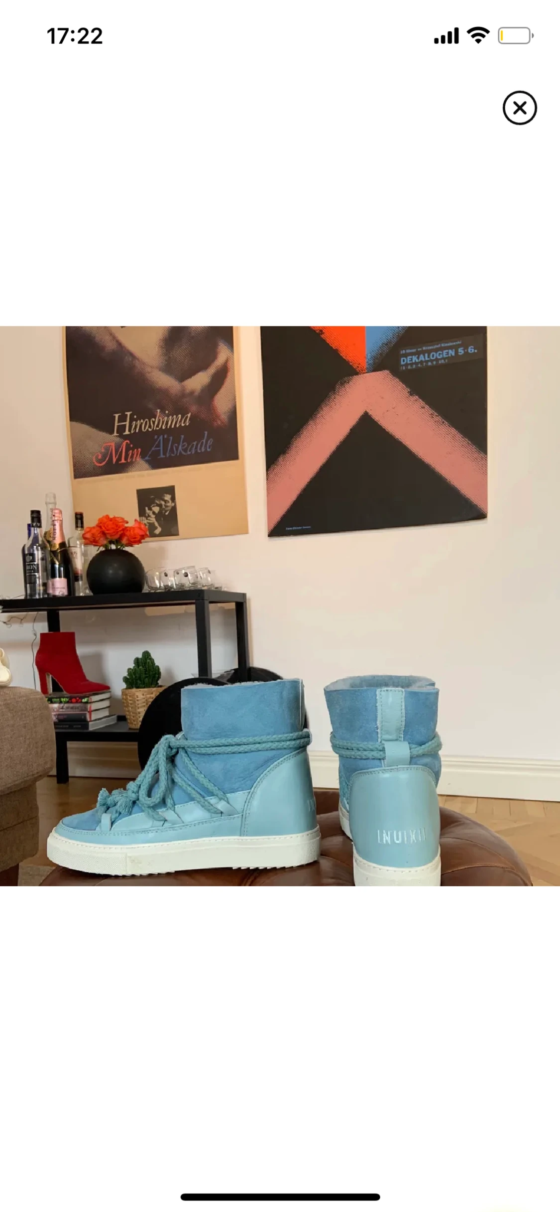 Säljer nu mina blåa inuikki skor som köptes här på plick för ca 2 år sedan (första bilden är lånad)! Dom är använda men i bra skick förutom att ena skon har gått sönder lite i bak (se bild)!