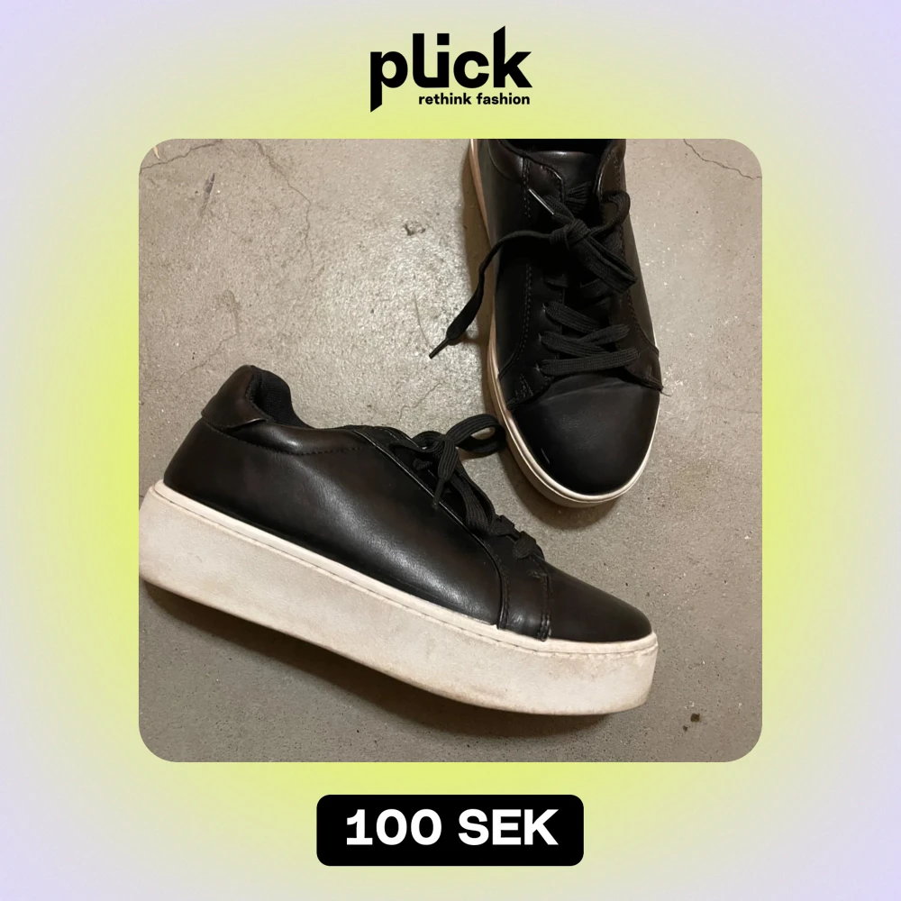 Säljer ett par svarta sneakers i skinn med vit sula. stilren design som passar perfekt till vardags. Skorna är i bra skick och redo för nya äventyr.