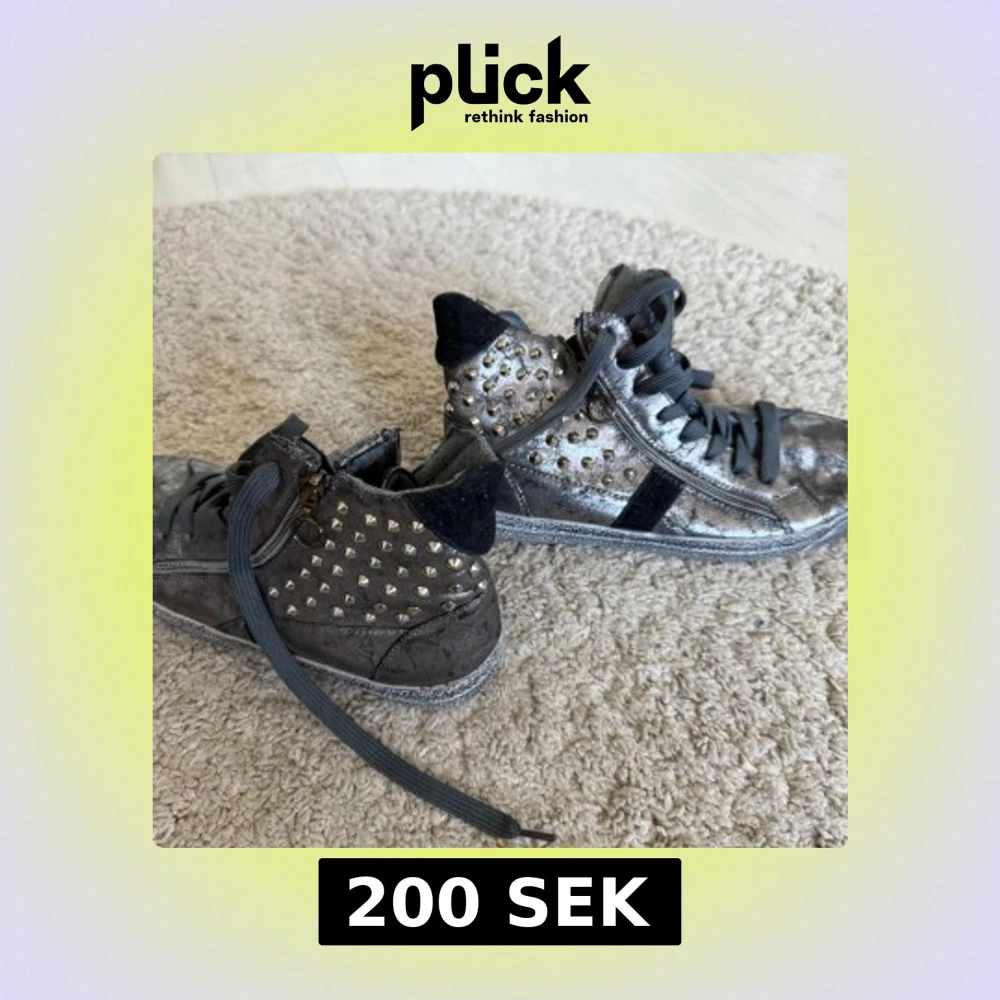 Säljer ett par grå sneakers med metallicfinish och silverfärgade nitar på sidorna. Skorna har svarta detaljer, snörning och en platt sula. Perfekta för dig som vill sticka ut med en cool och glittrig look.