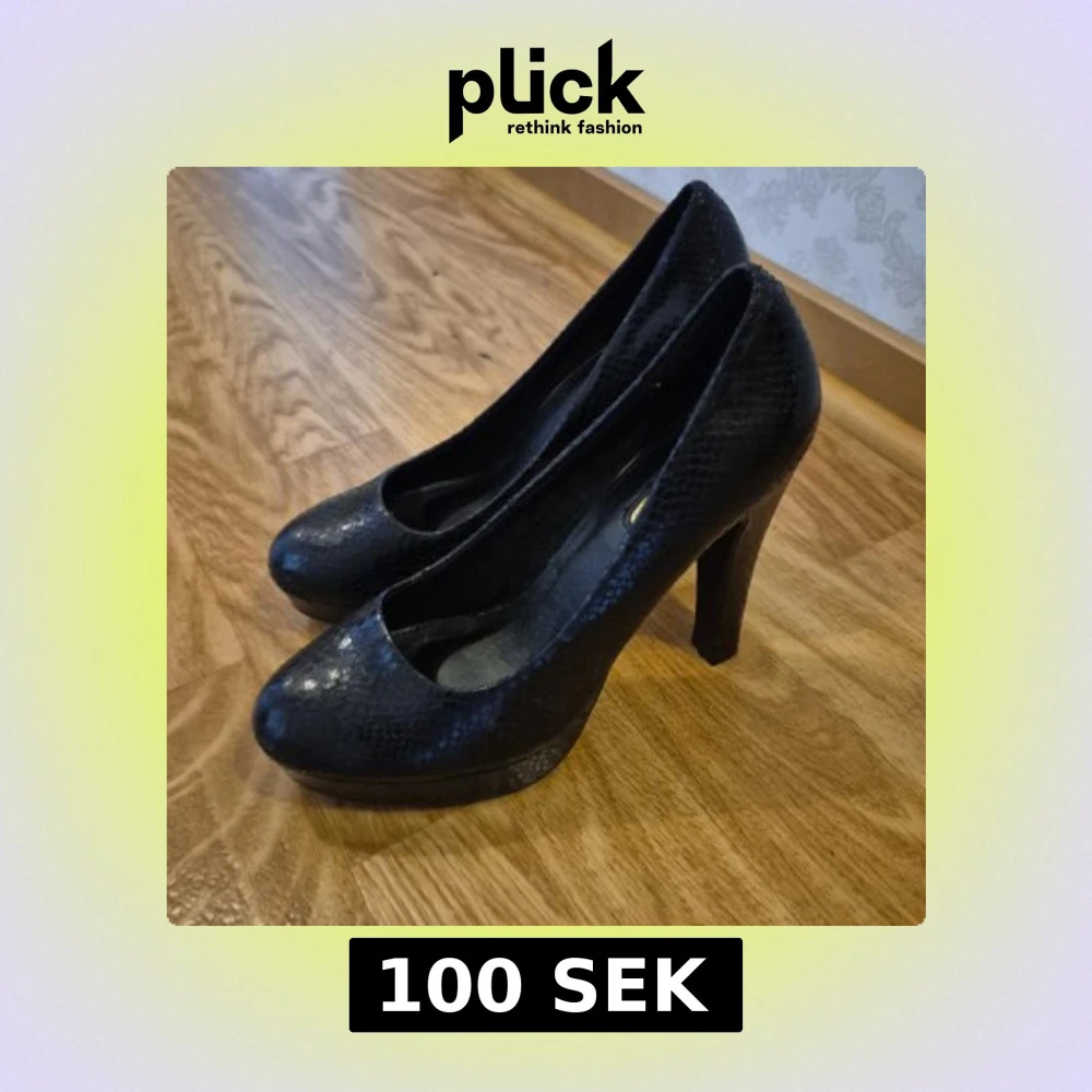 Säljer ett par svarta pumps med hög klack och rund tå. Skorna har ett snyggt ormskinnsmönster och en plattform framtill som ger extra höjd. Perfekta för dig som vill ha en klassisk men ändå trendig look.
