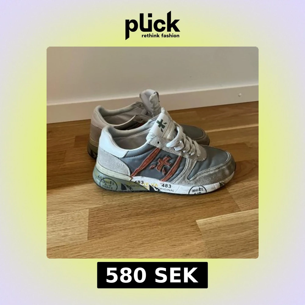 Säljer ett par grå och vita sneakers från Premiata med orange detalj på sidan och vit snörning. Skorna har en platt sula med tryck och rund tå. Perfekta för dig som gillar en sportig och trendig stil.