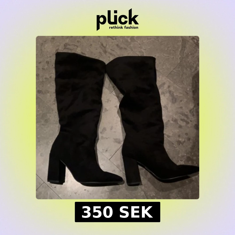 Säljer ett par svarta höga stövlar med bred klack och spetsig tå. Stövlarna är tillverkade i mocka och har en stilren, elegant look som passar perfekt till jeans eller kjol. De är knähöga och har en plattformad sula för extra komfort.
