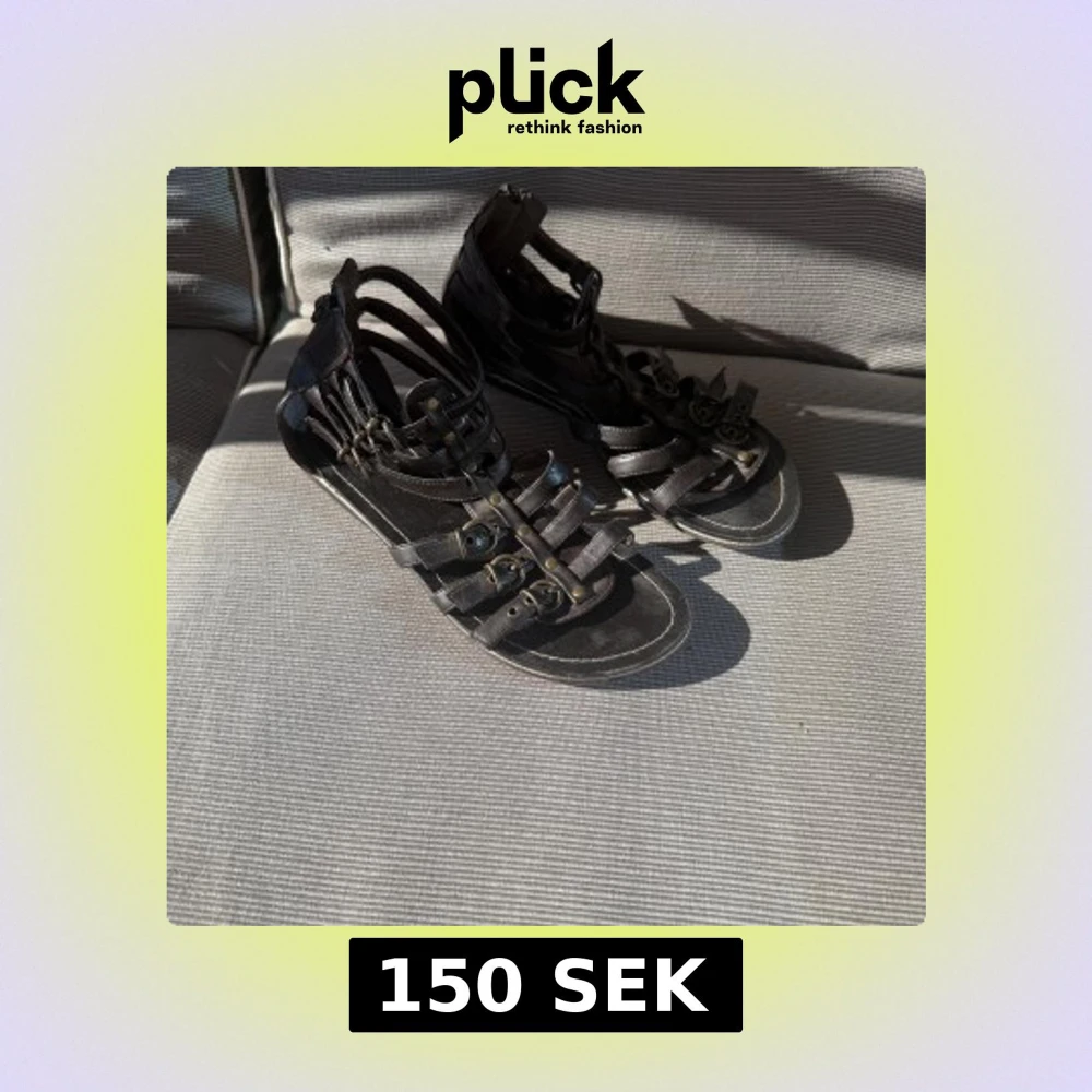 Svarta gladiatorsandaler i skinnimitation med flera remmar och snygga metallspännen. Dragkedja baktill för enkel påtagning och blommönster under sulan. Perfekta för en cool sommarlook.
