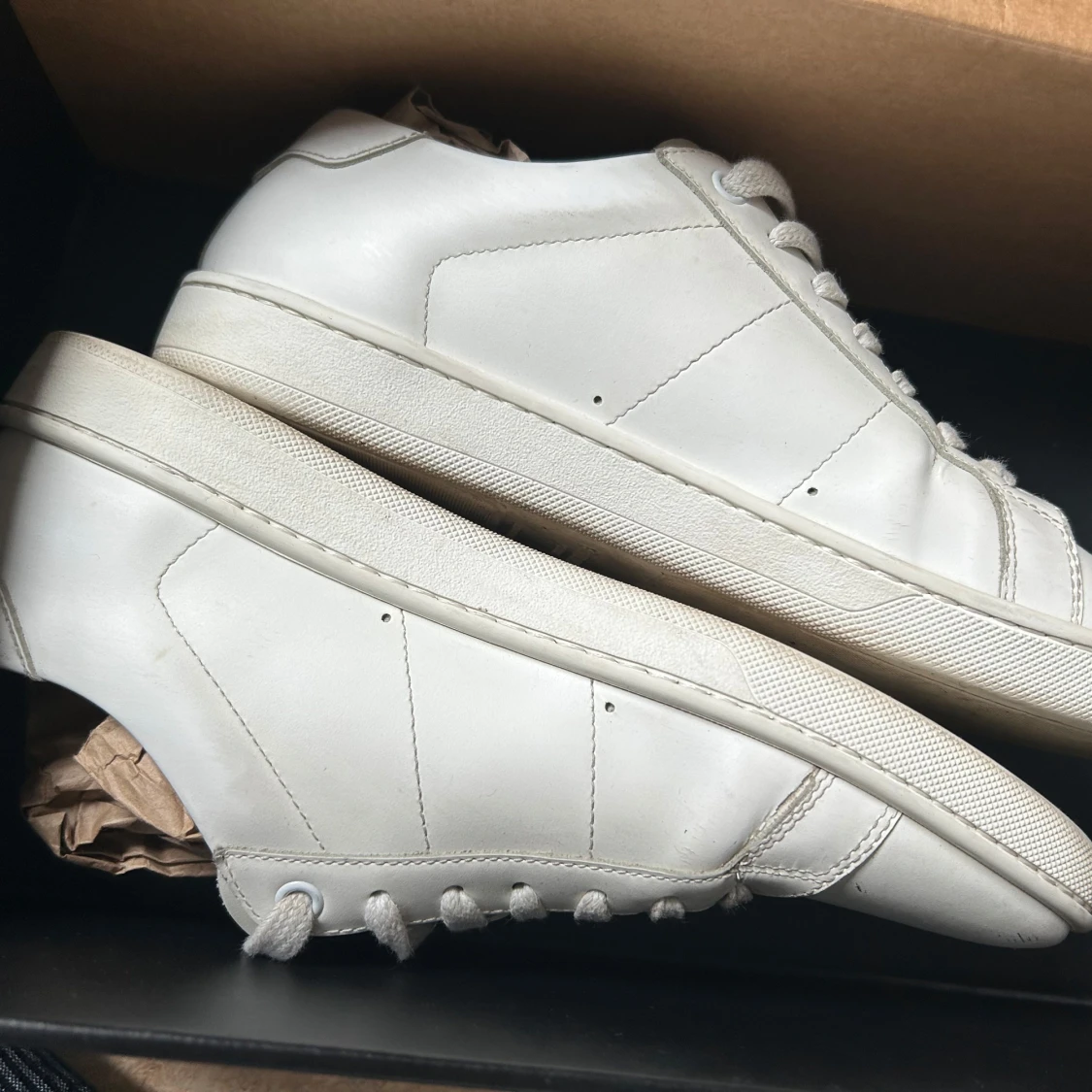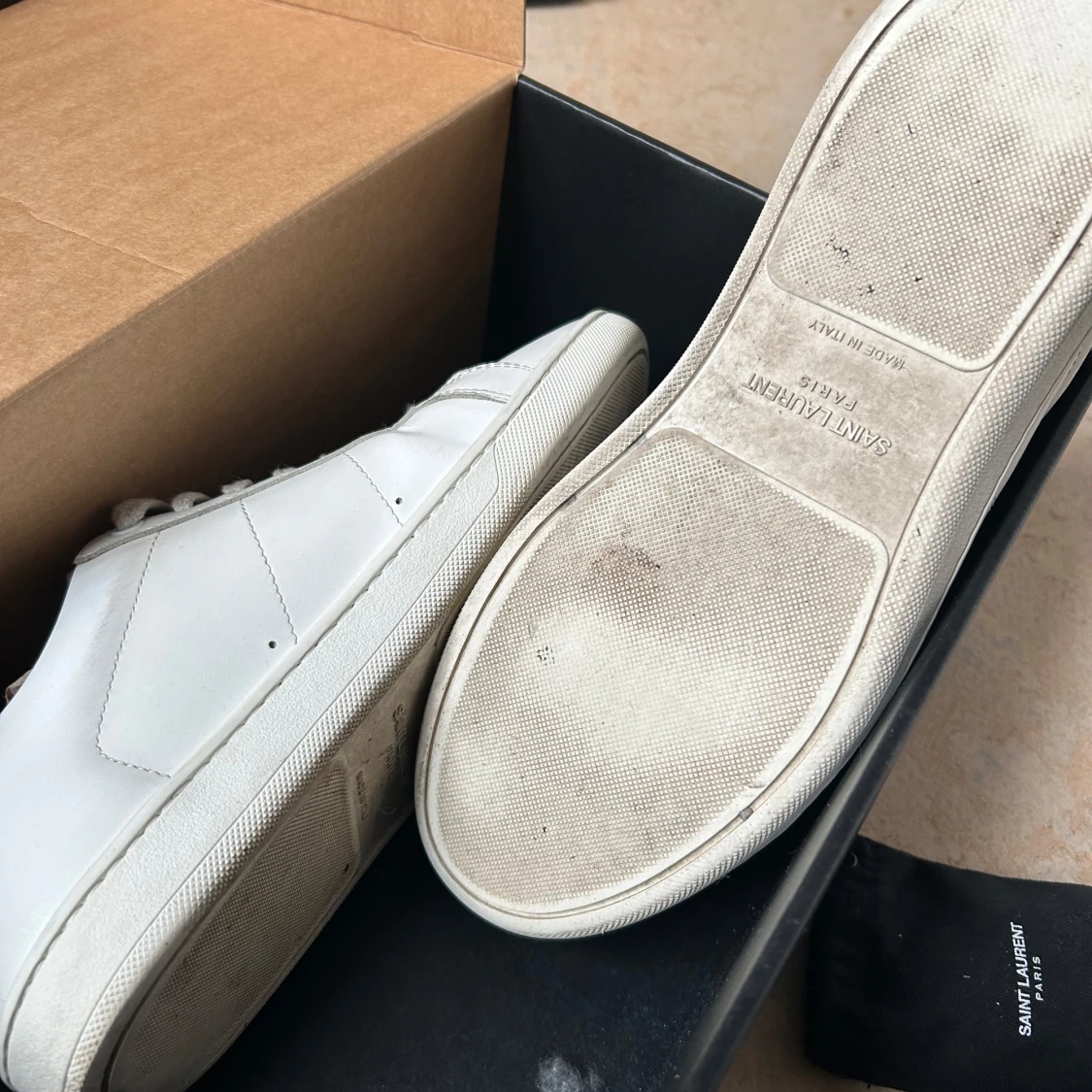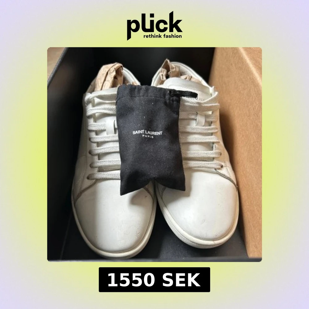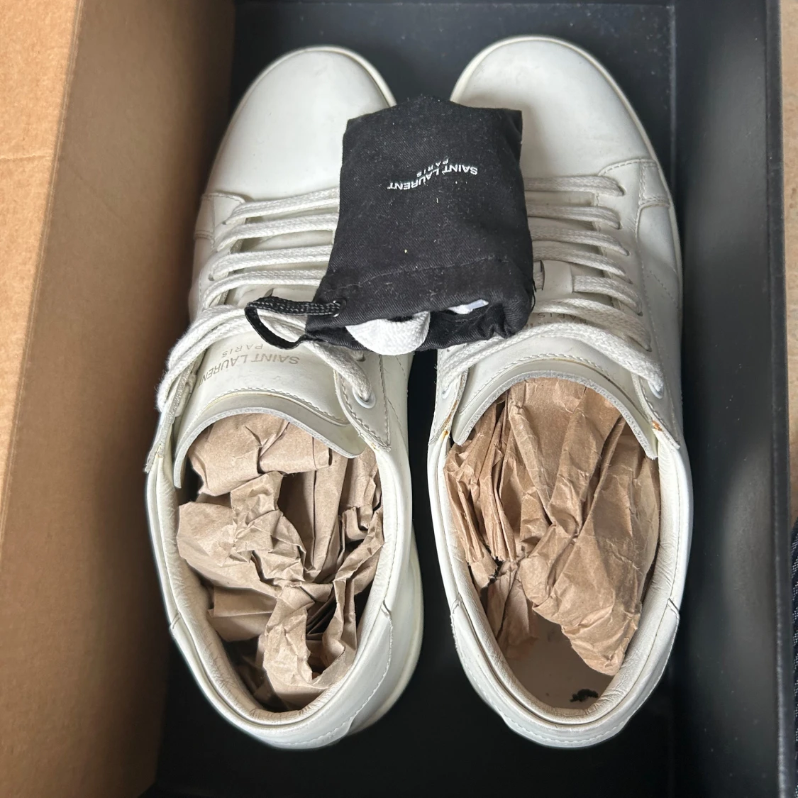 Snygga vita sneakers från Saint Laurent Paris i stilren design. Skorna är tillverkade i slätt skinn med rund tå, platt sula och klassisk snörning. Perfekta för dig som gillar minimalistisk och lyxig streetstyle. Kommer med originalbox och extra snöre. Skorna har använts fåtal gånger och är i bra skick, strolek 39 men pasar mig som har 40,5!