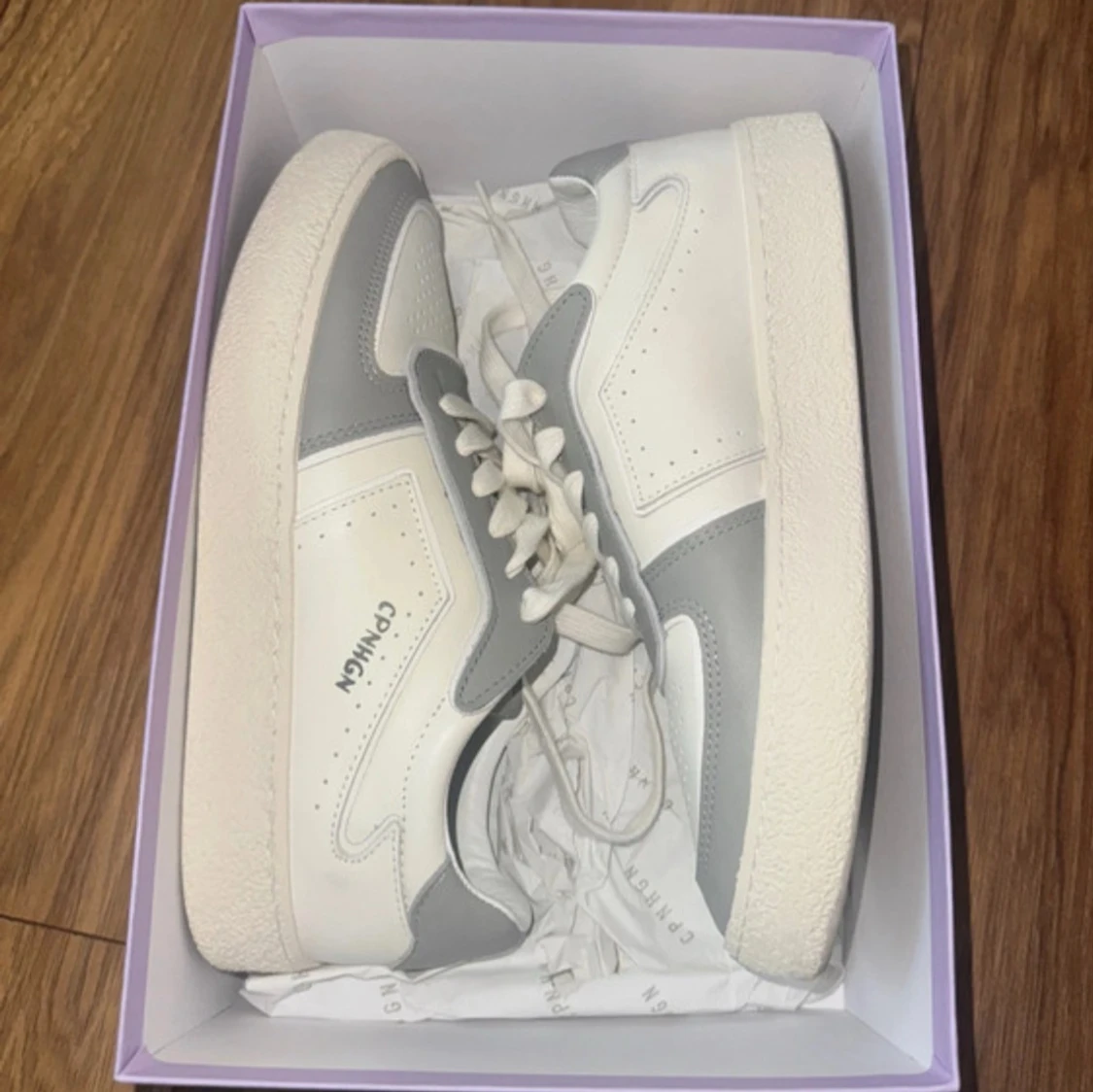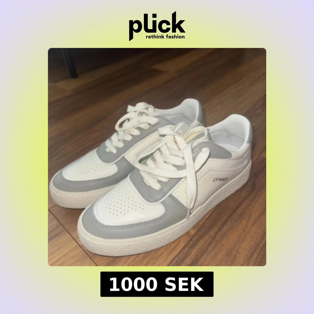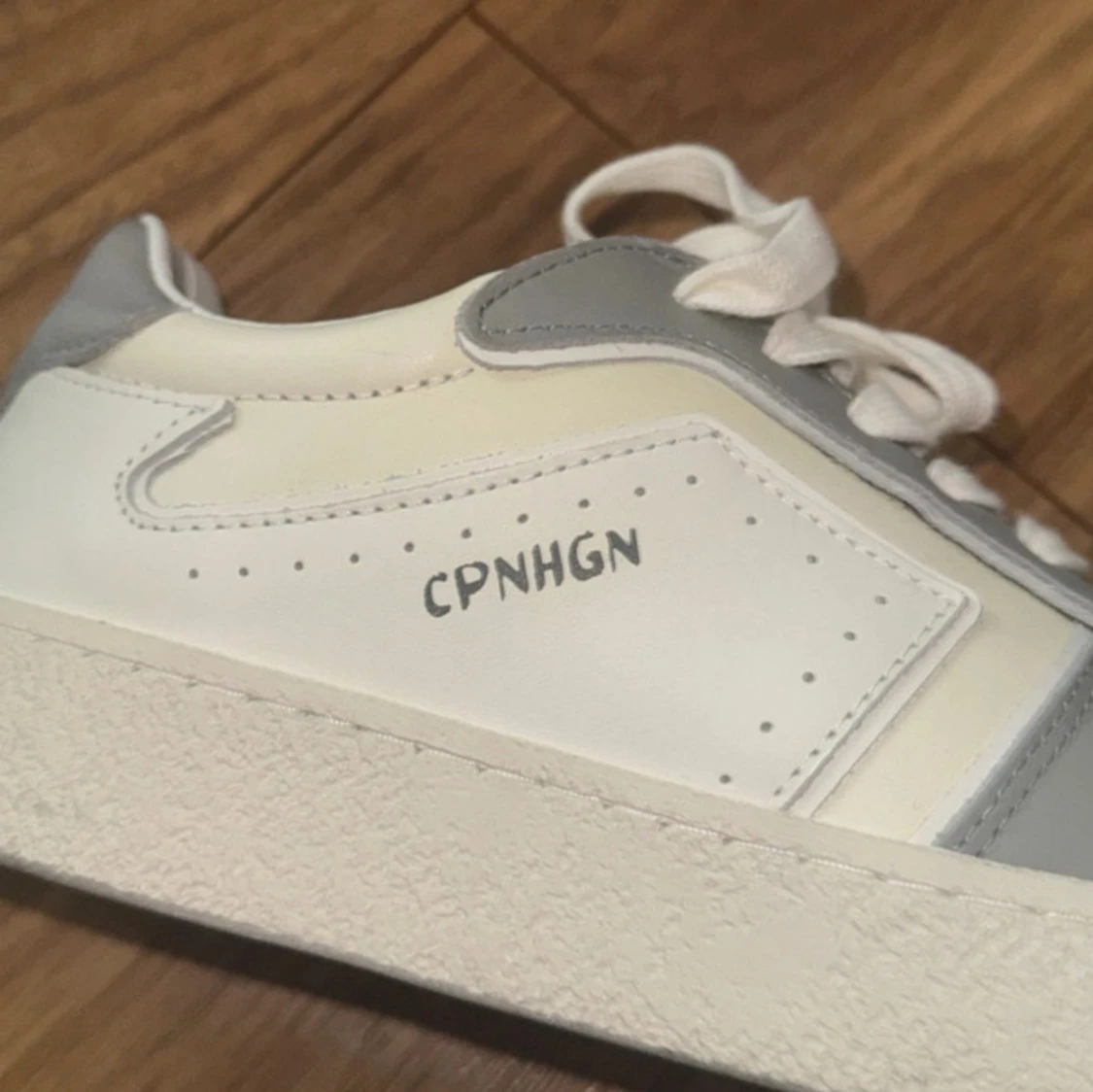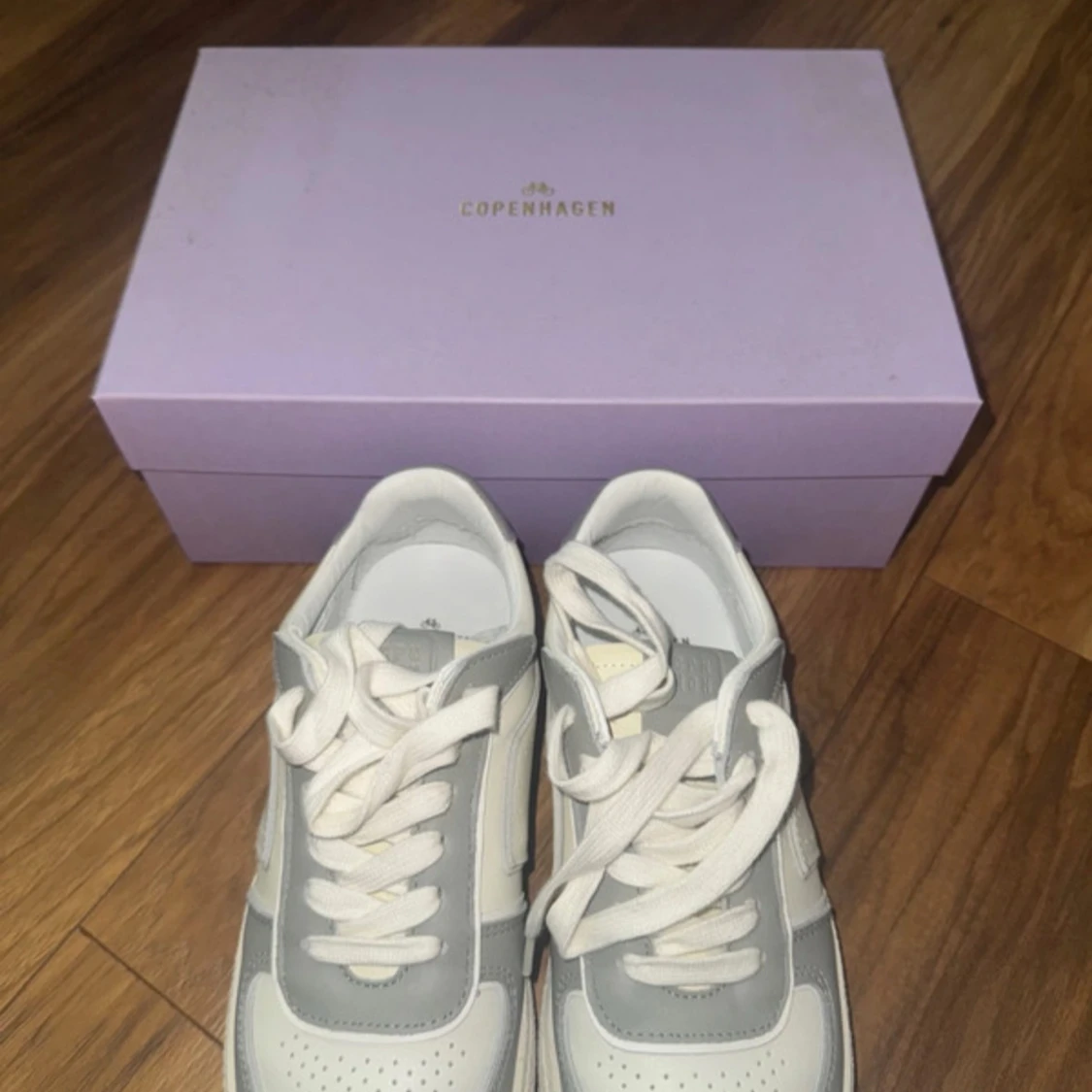 Snygga sneakers från Copenhagen i vitt och ljusgrått skinn. Klassisk modell med rund tå, perforerade detaljer och tjock vit sula. Skorna har snörning och stilren logga på sidan. Perfekta för en clean och trendig look. Funkar både på tjejer och killar. Hör av er vid frågor! Köpta för 1800kr säljer för 1000kr!