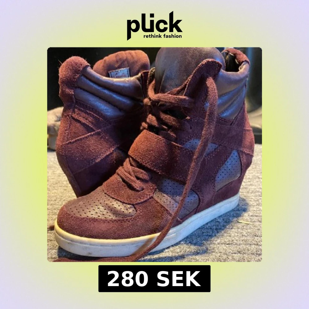 Säljer ett par vinröda sneakers med inbyggd kilklack och snygga detaljer i mocka och perforerat syntetmaterial. Skorna har snörning och kardborreband för extra cool look. Perfekt för dig som vill ha lite höjd men ändå känna dig bekväm.