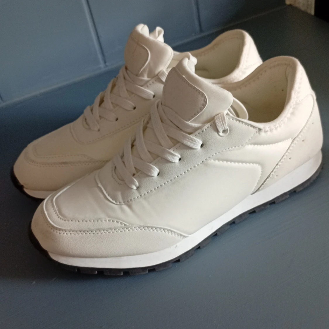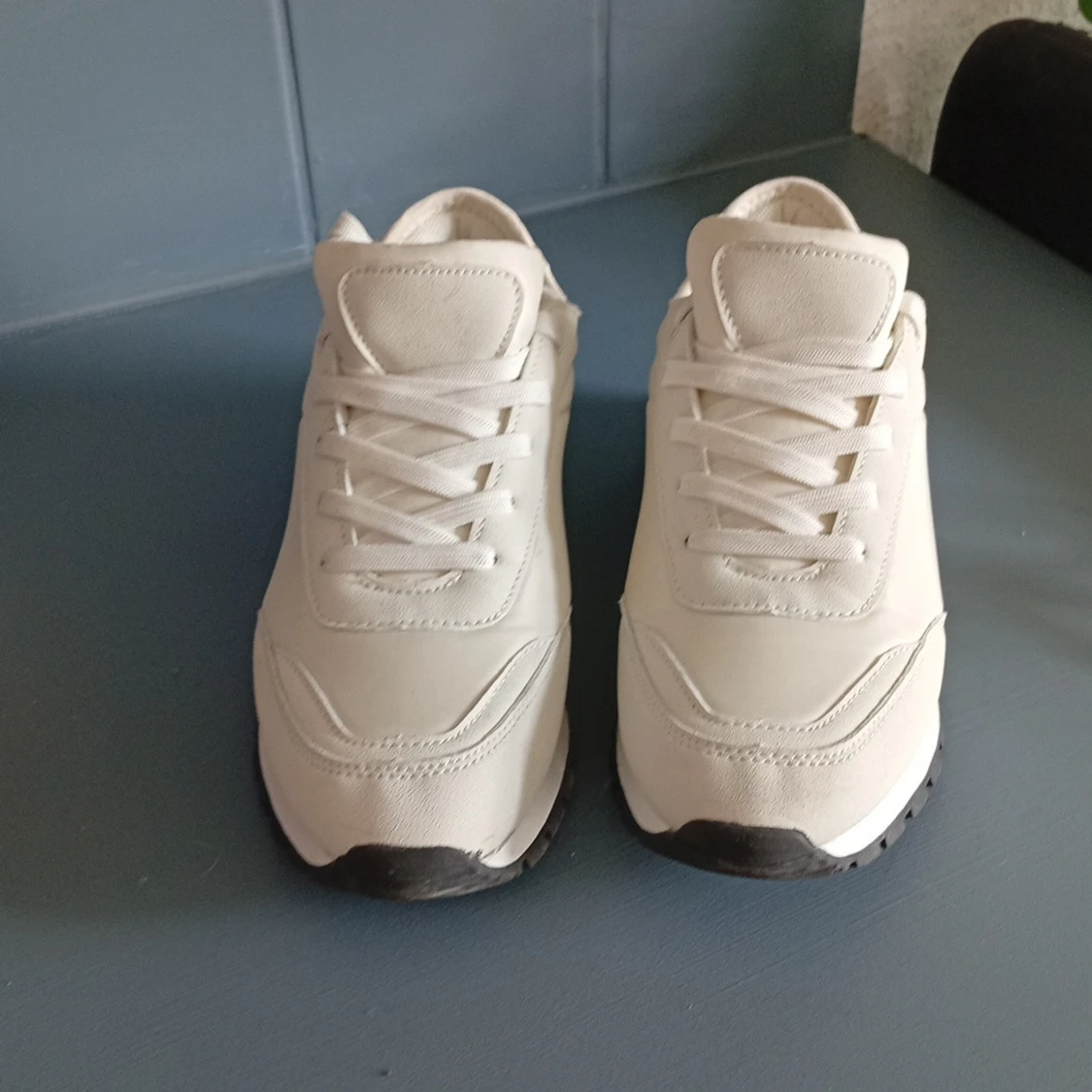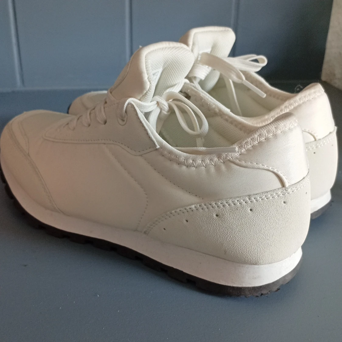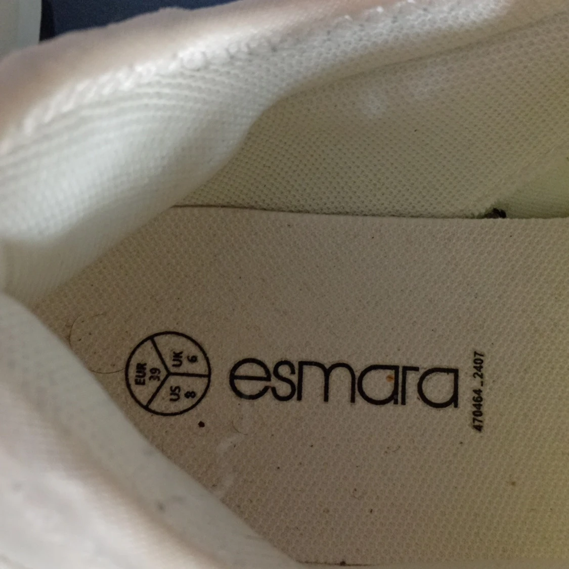 Snygga vita sneakers från Esmara i storlek 39. Skorna har klassisk design med rund tå, snörning och platt sula. Ovandelen är i syntetmaterial och textil, med svarta detaljer på sulan. Perfekta för en clean och stilren look.